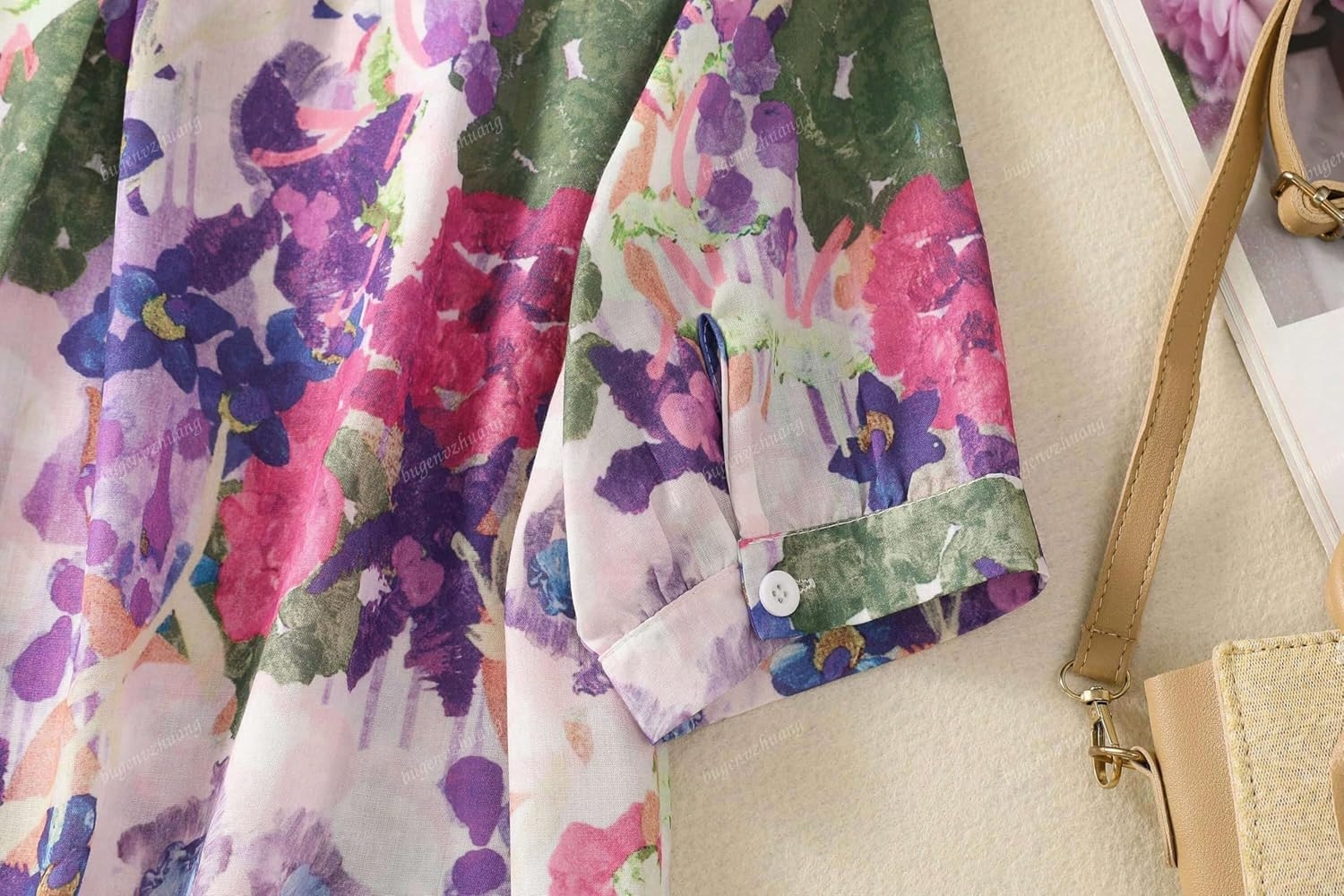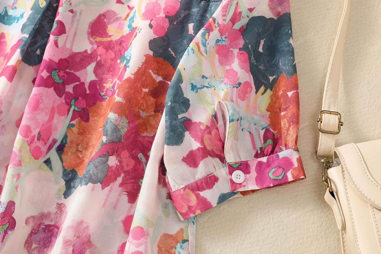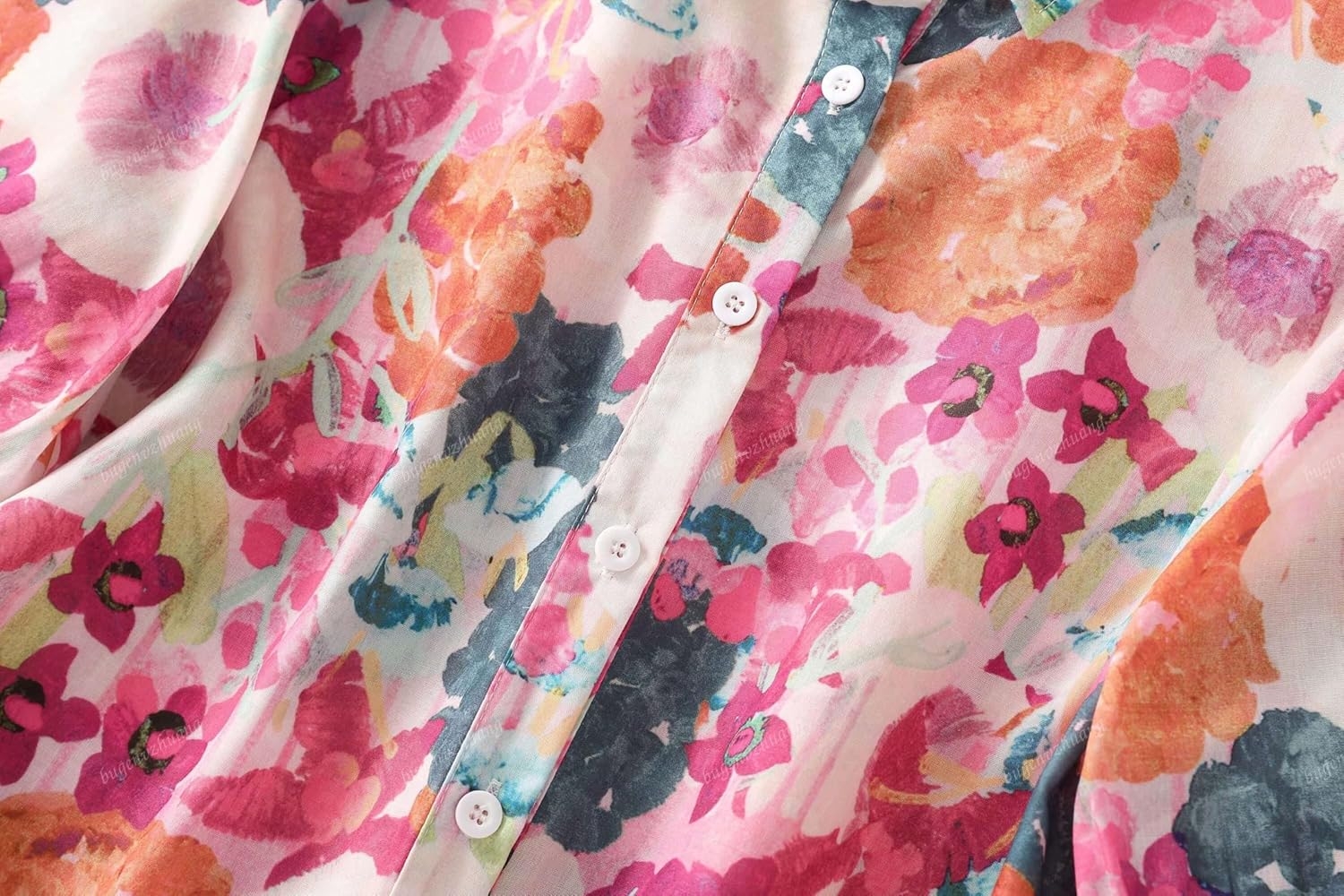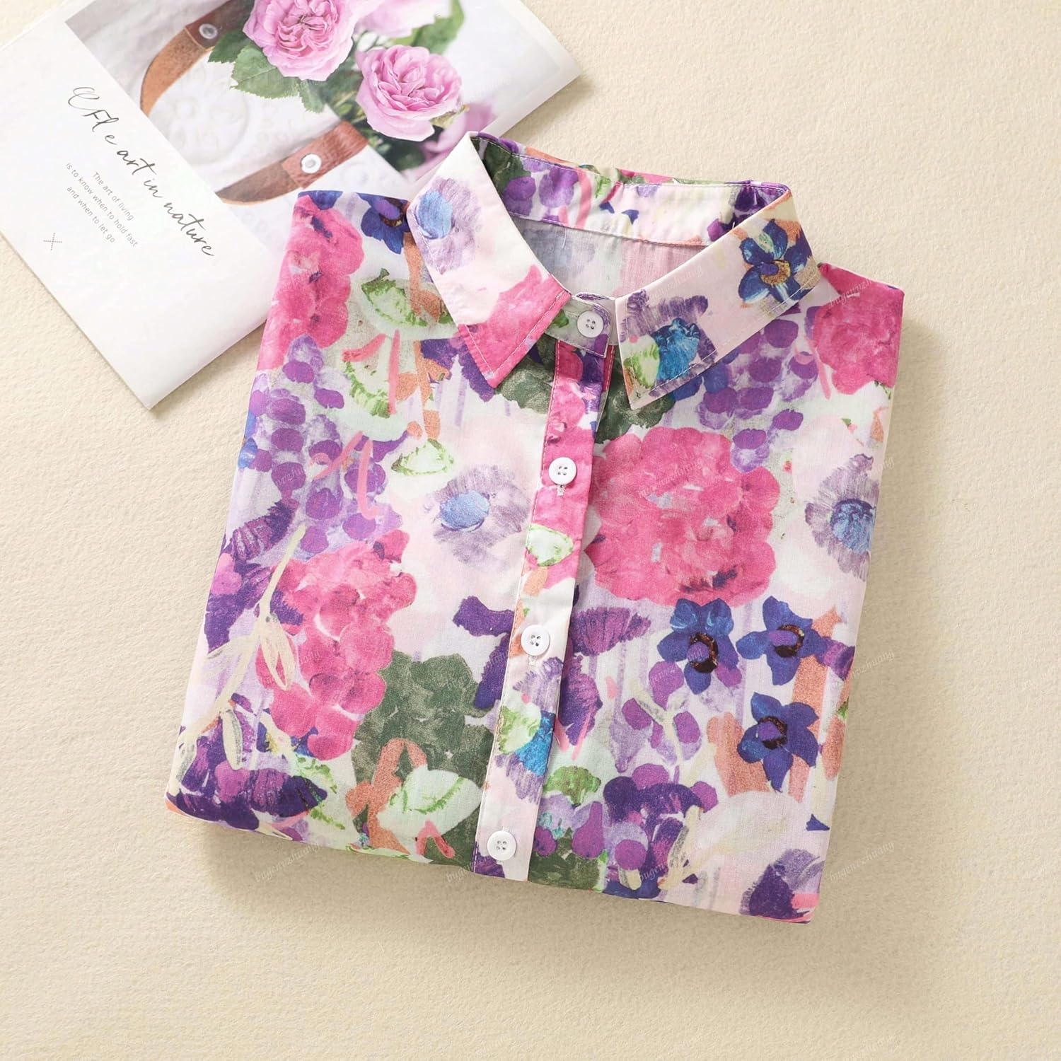 Step into effortless elegance with this Gufrina women’s button-down shirt, designed in a soft and breathable fabric that ensures comfort throughout the day. The shirt features a striking floral print dominated by mustard yellow, purple, orange, and white hues that give it a vibrant and fresh appeal. The playful watercolor-style floral motifs make it perfect for spring and summer seasons, while the combination of vivid colors adds charm to your everyday outfit. Designed with a full button-down front, this shirt has a smart collar neckline that adds structure and polish. The elbow-length sleeves with buttoned cuffs enhance the relaxed, yet put-together feel of the shirt. Its slightly flared hem and soft pleats at the back ensure ease of movement and flatter all body types, offering a casual yet graceful silhouette. The lightweight nature of the fabric makes it an ideal choice for daily wear, travel, weekend brunches, and casual office settings. Whether styled with denims, shorts, or solid trousers, this multicolor floral shirt adapts to different occasions and styles. Pair it with flats or sandals for a laid-back summer look, or tuck it into high-waist pants for a more defined appearance. The colorful and artistic floral pattern keeps the outfit playful, making it a versatile addition to your wardrobe.
