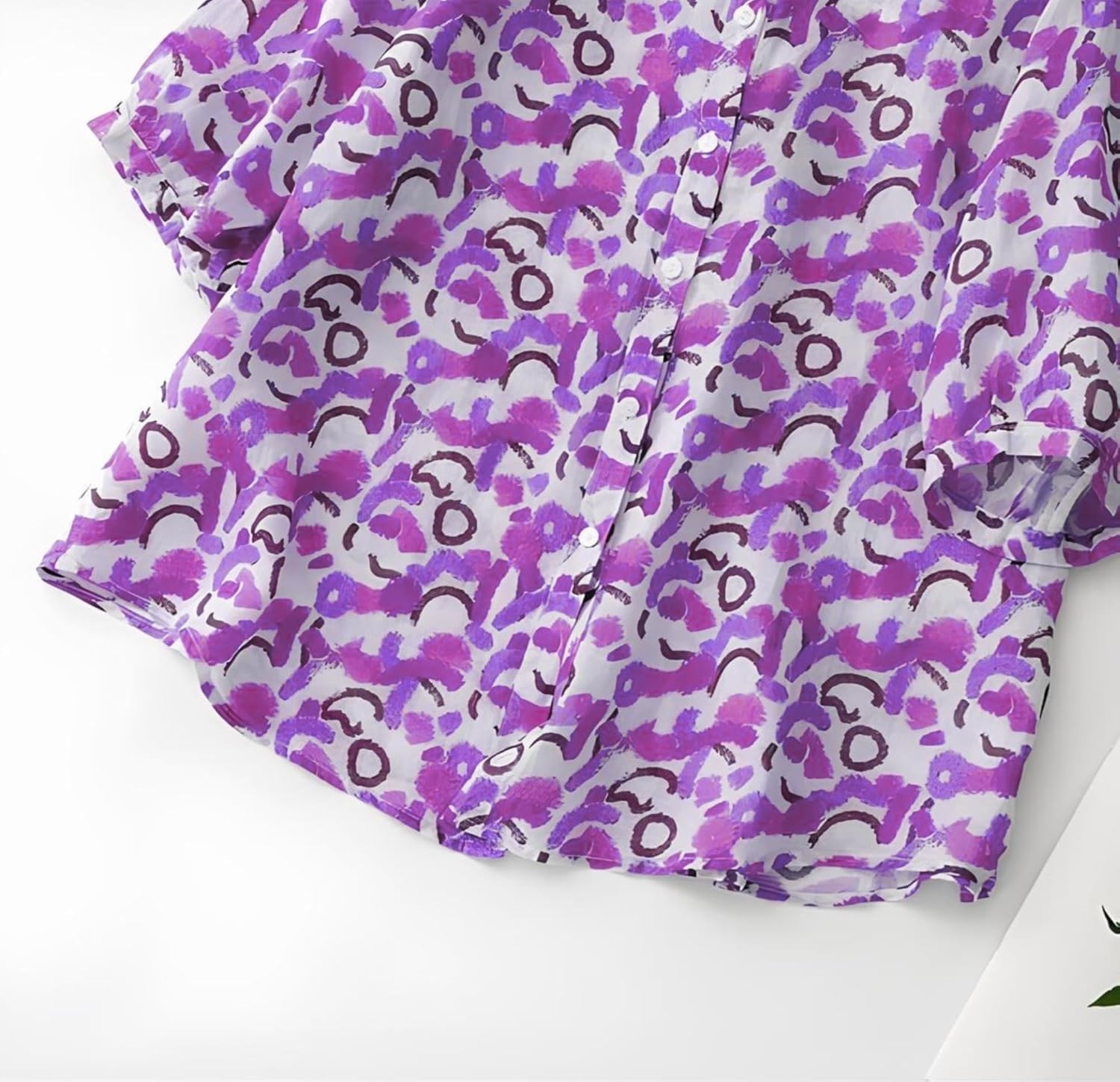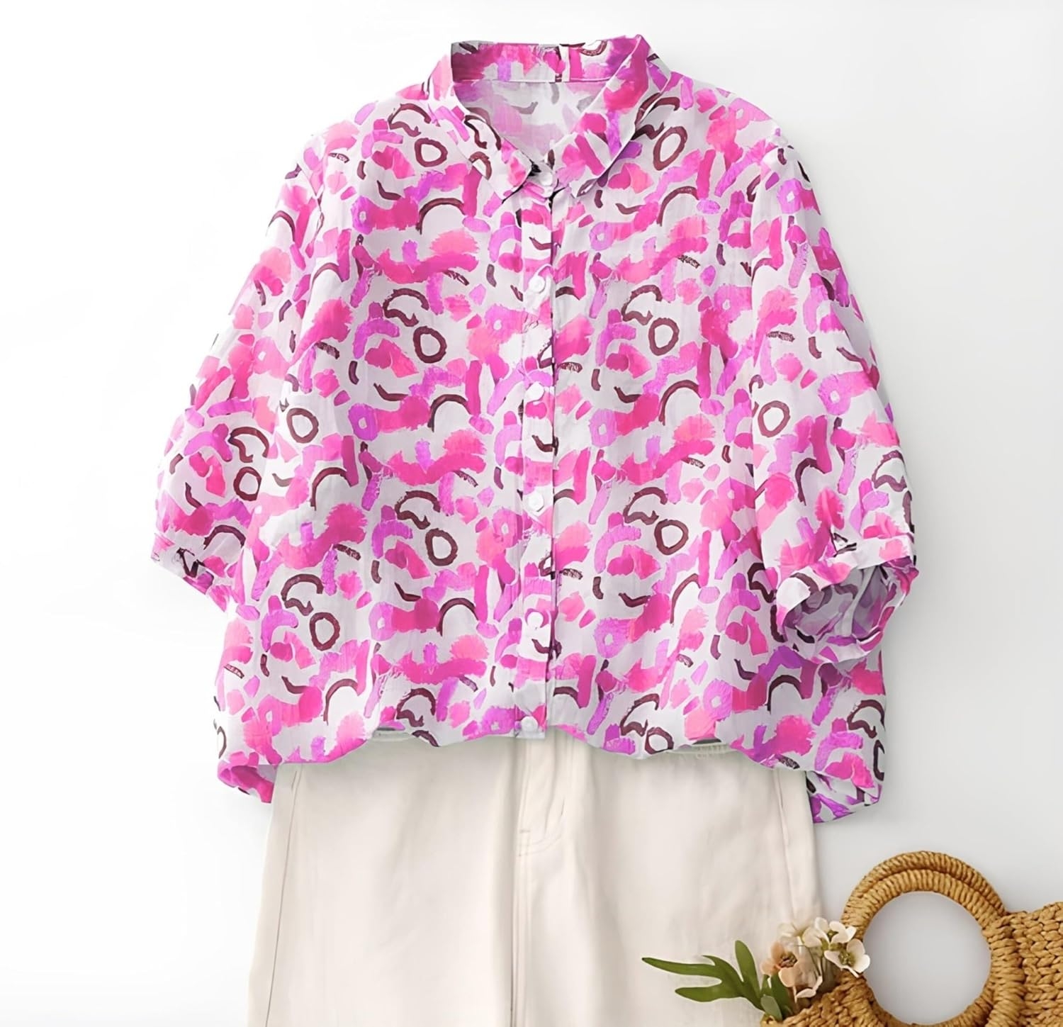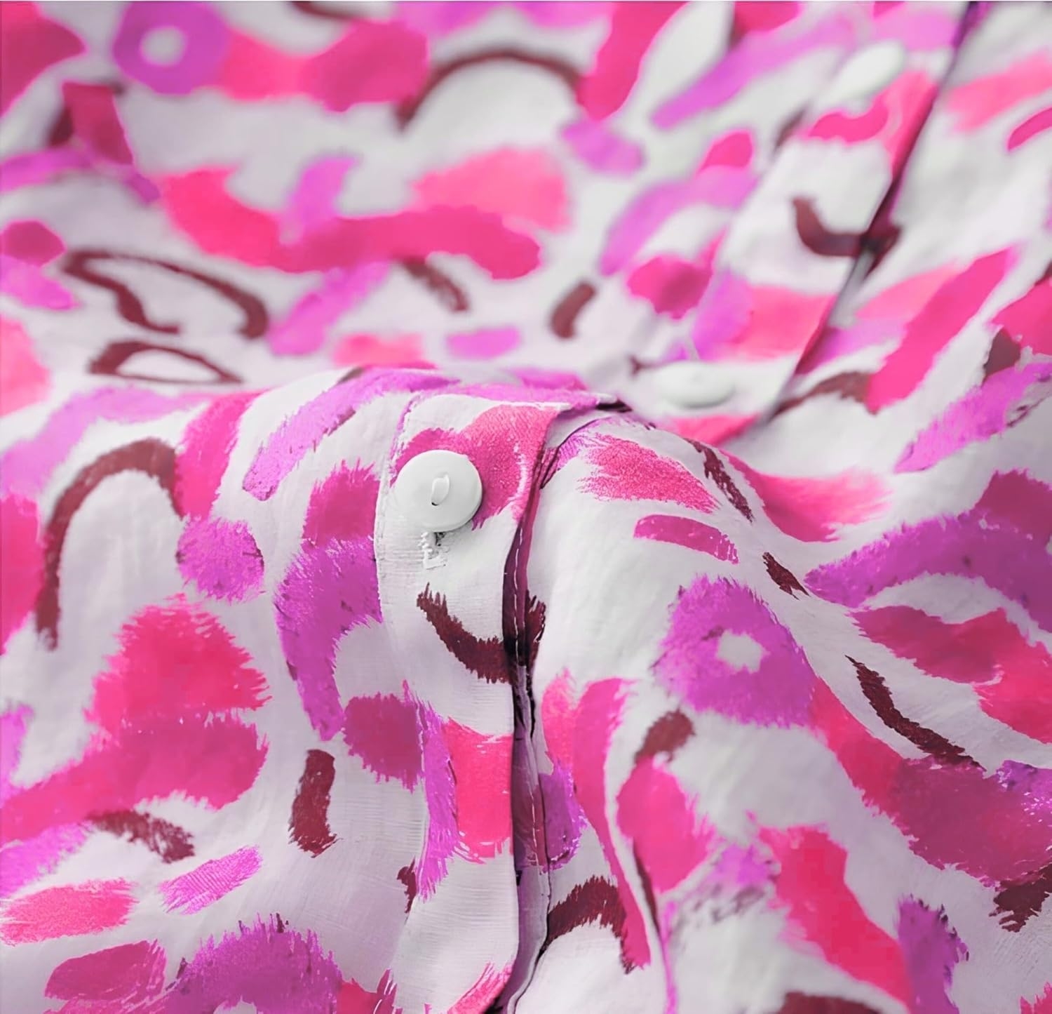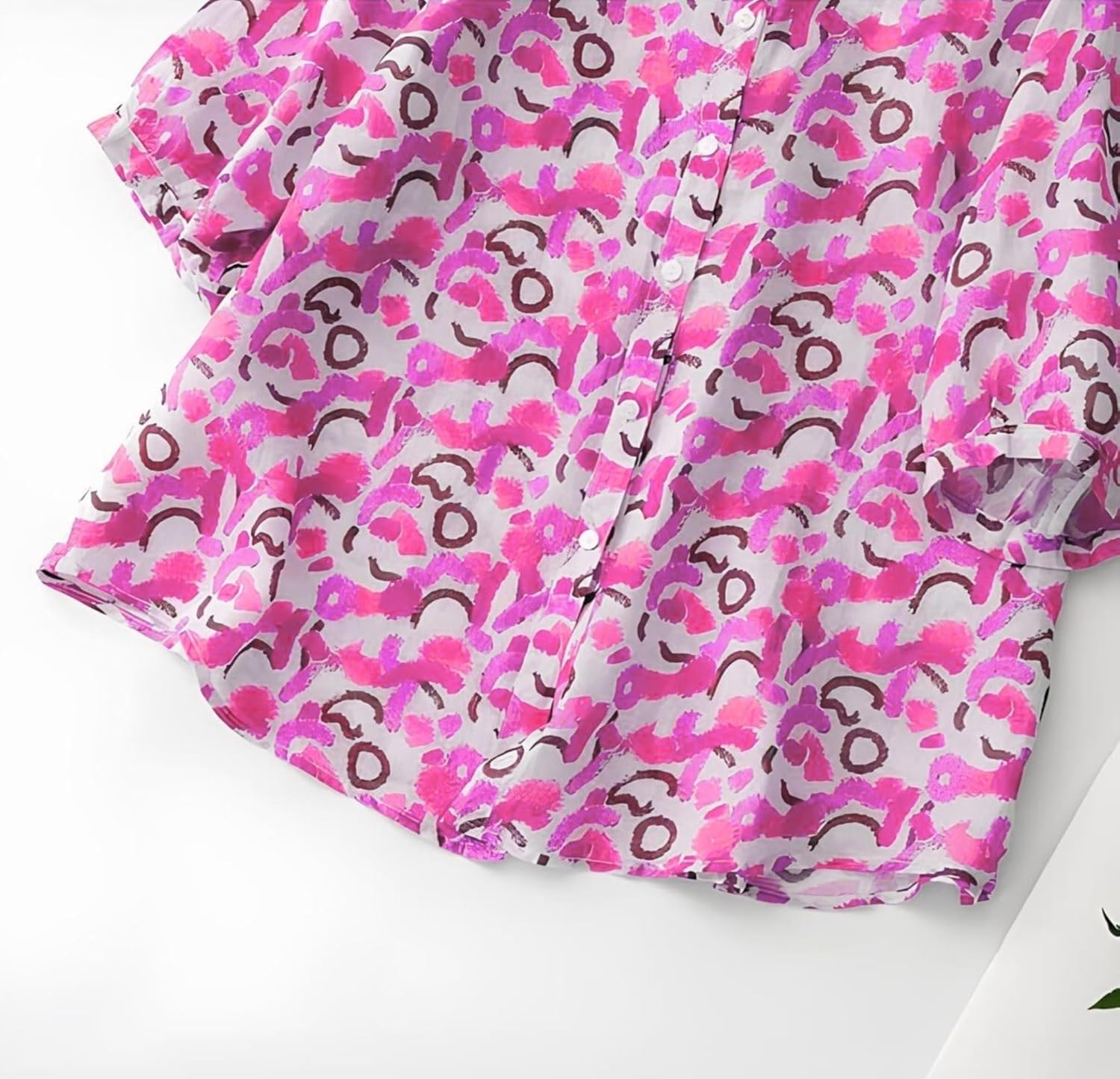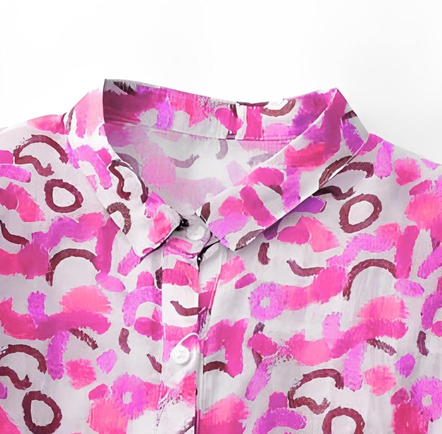 Women’s button-down printed shirt collection in pink, purple, and sea green – bold casual wear.