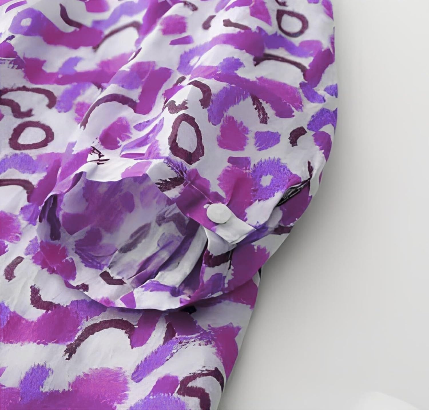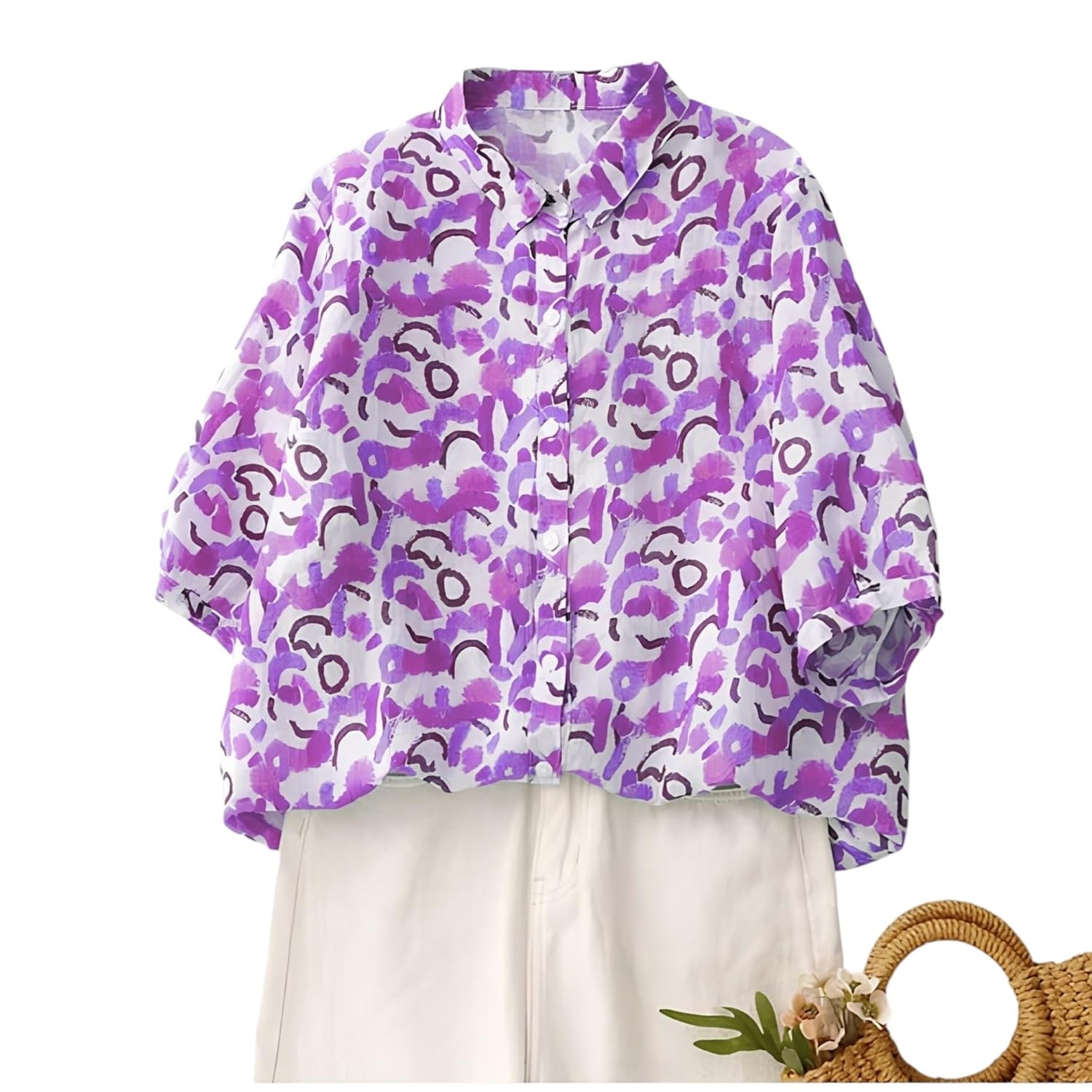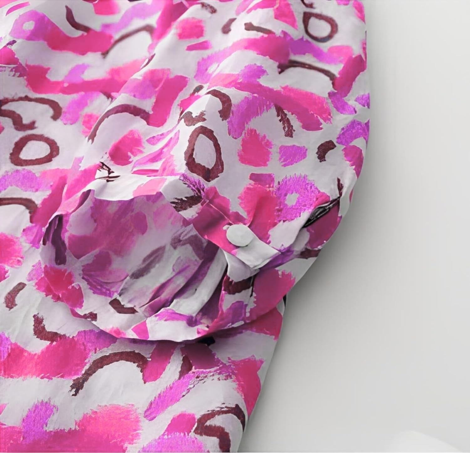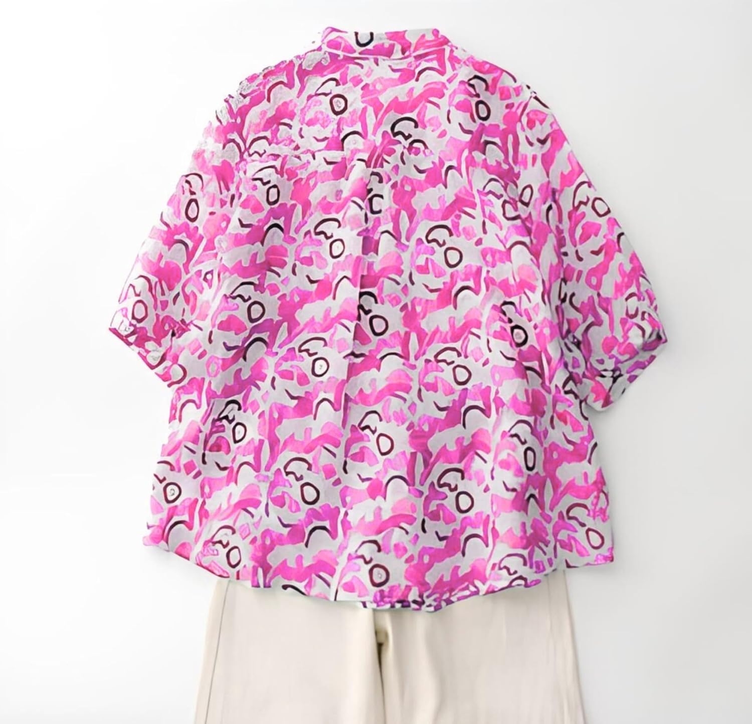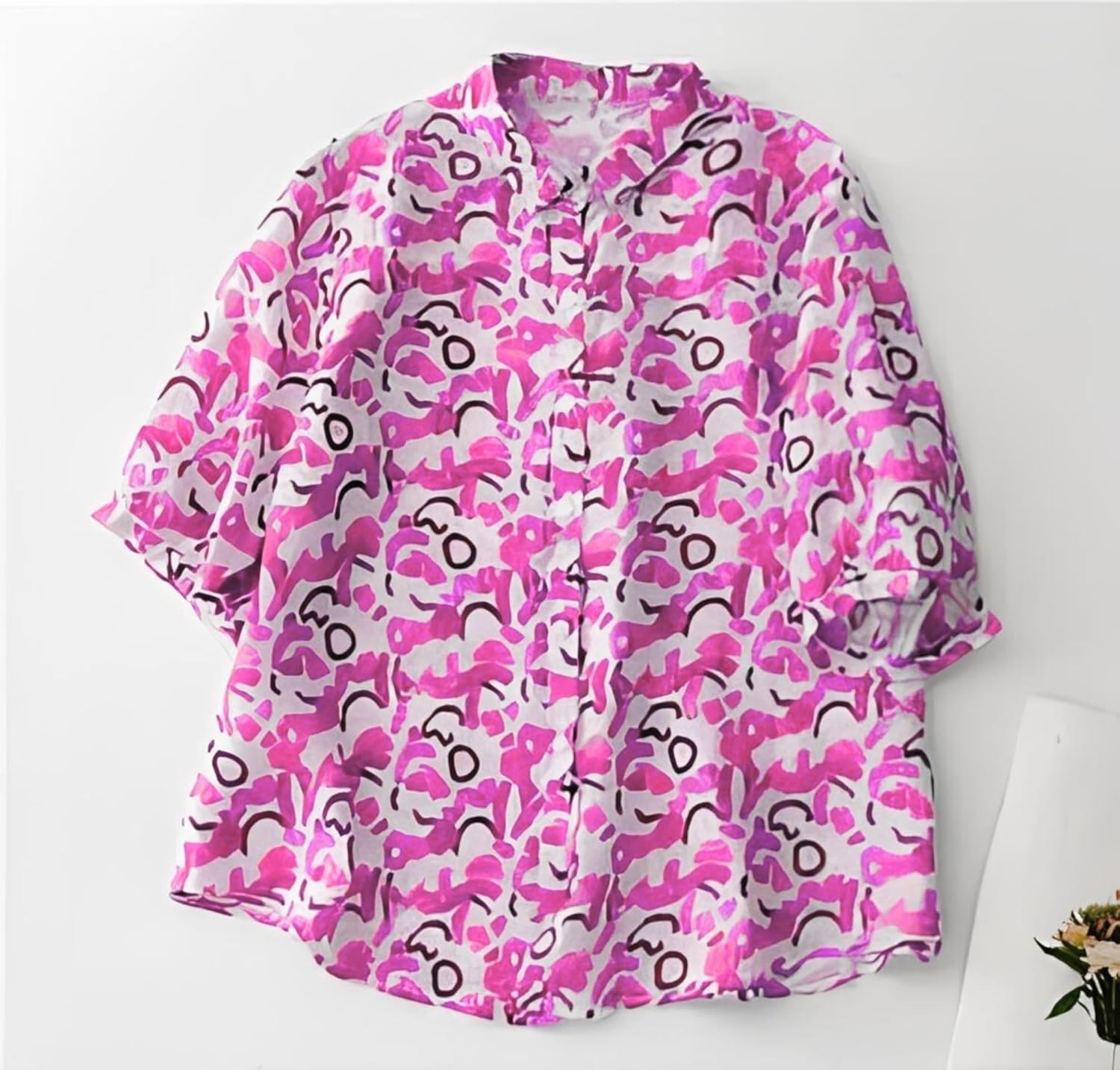 Women’s button-down printed shirt collection in pink, purple, and sea green – bold casual wear.