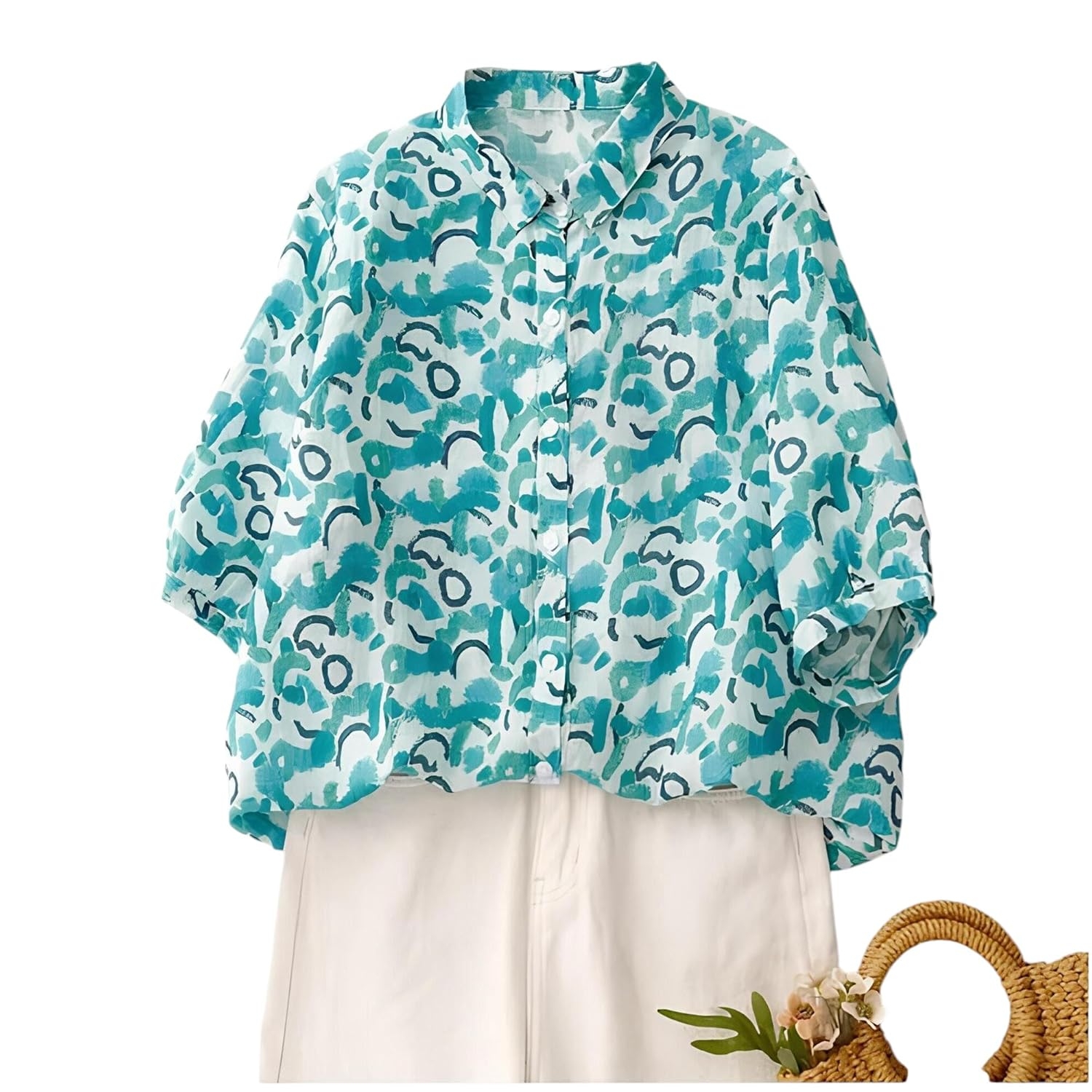 Gufrina Women’s Abstract Printed Button Down Shirt with Mandarin Collar and Above Elbow Sleeve Relaxed Fit Top