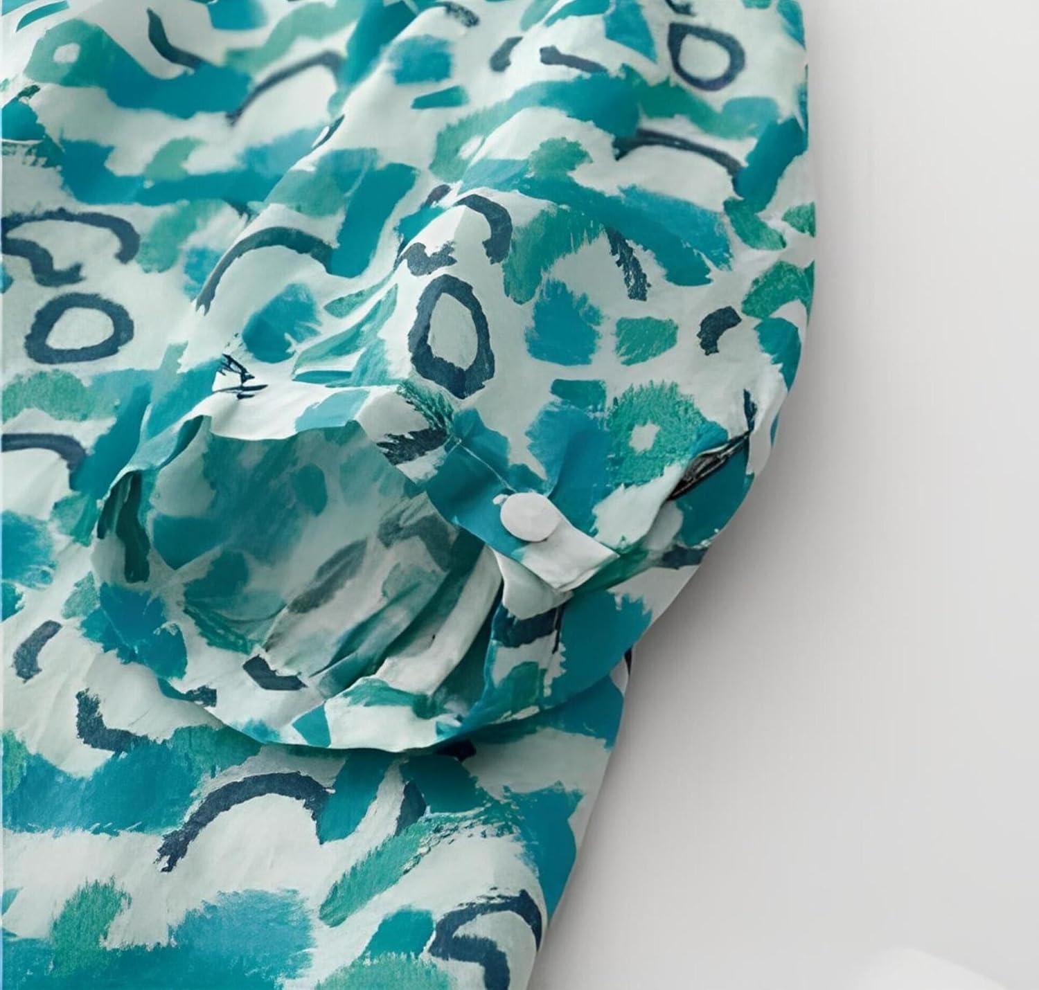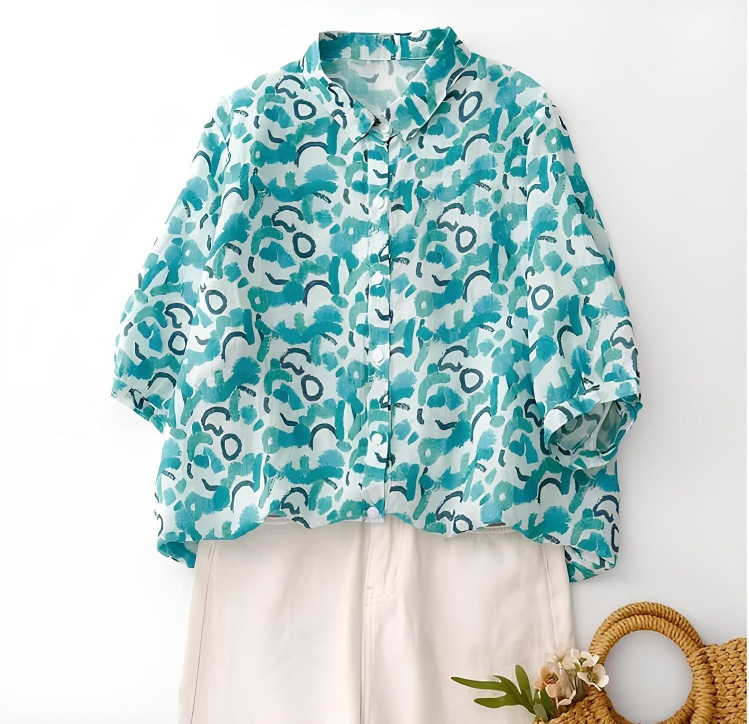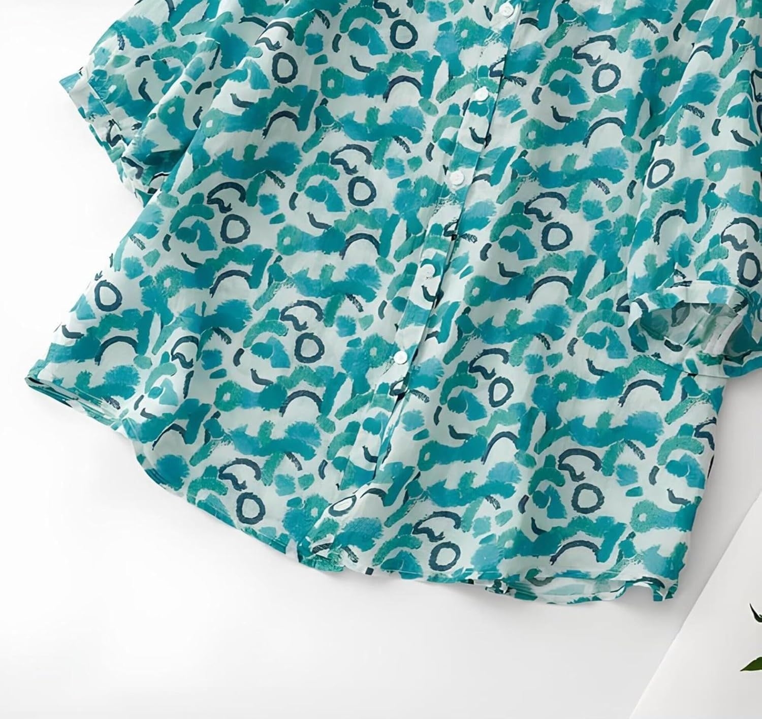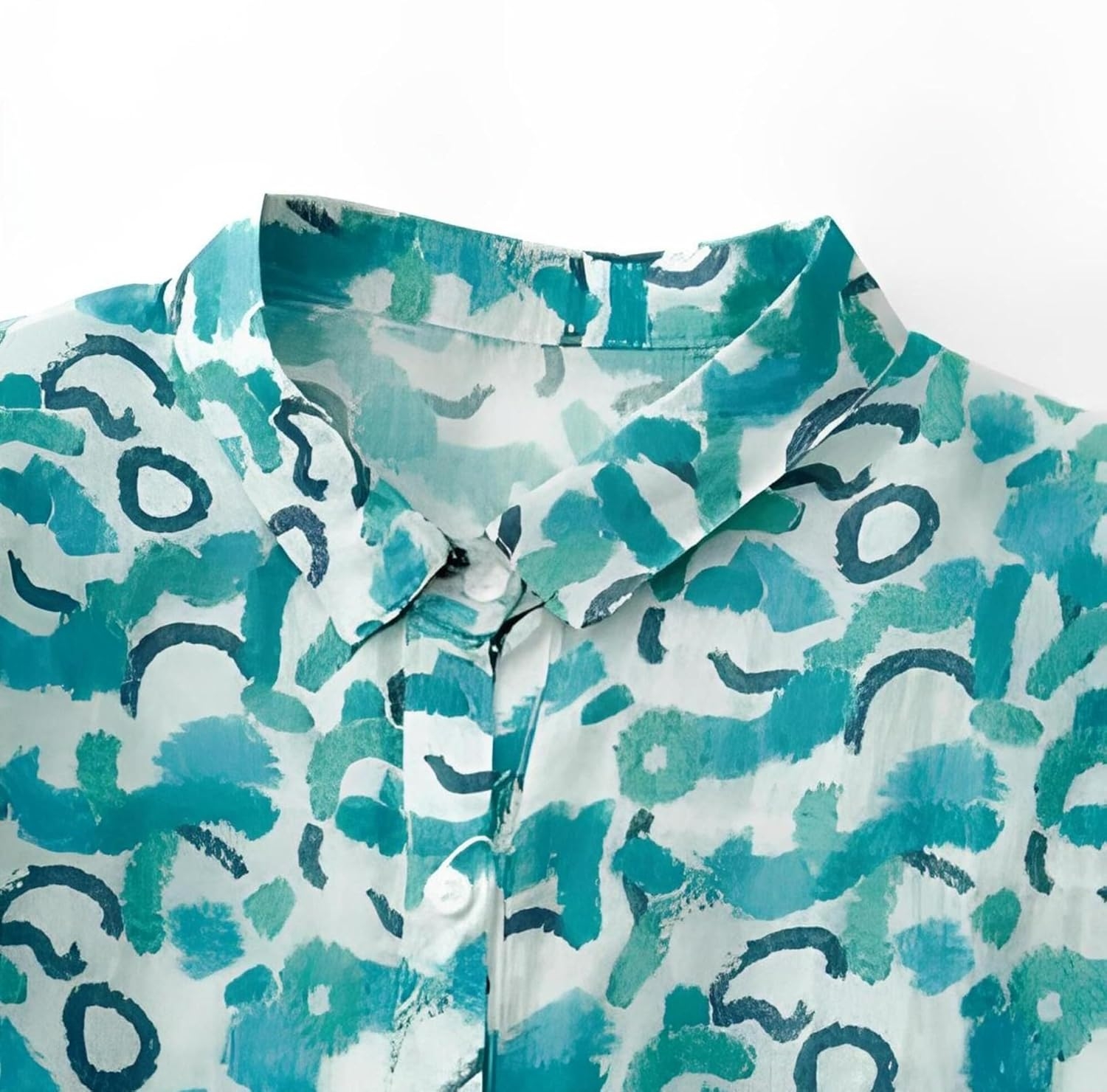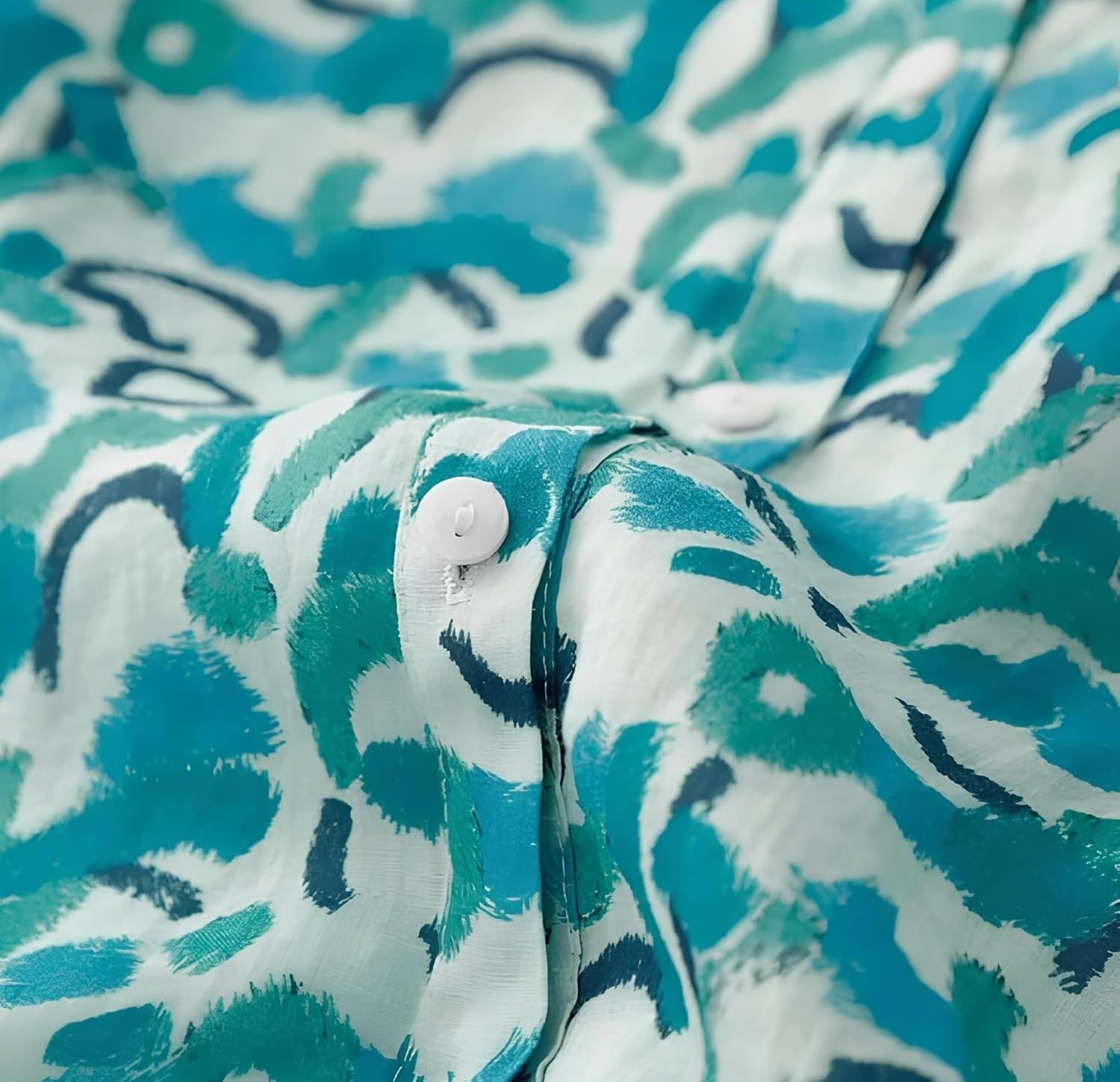 Close-up of collared neckline, fabric texture, and sleeve style of women’s printed shirts