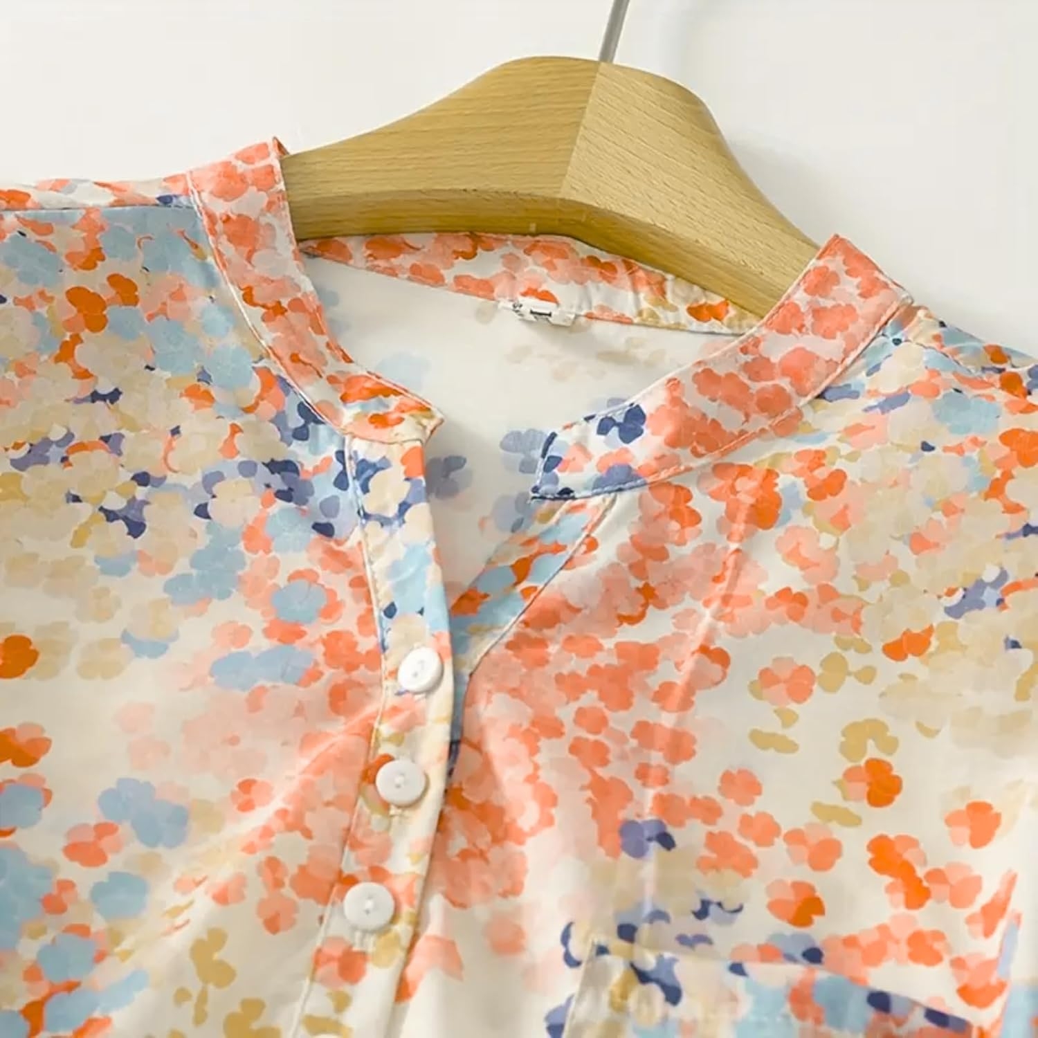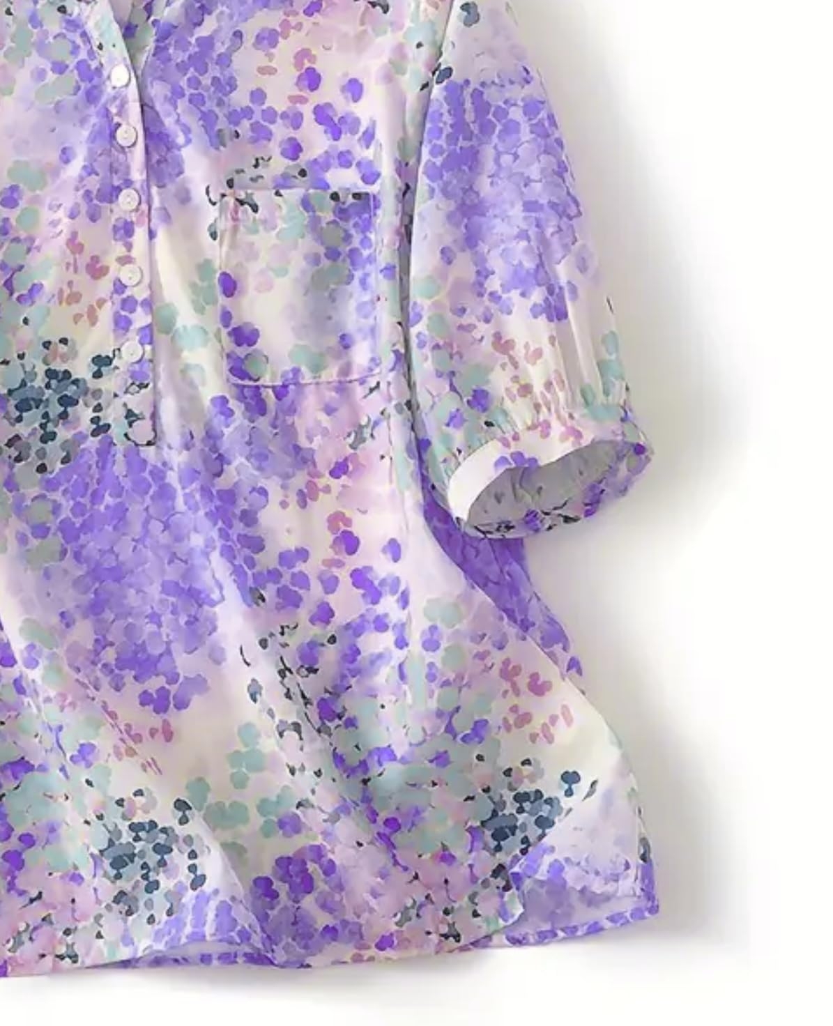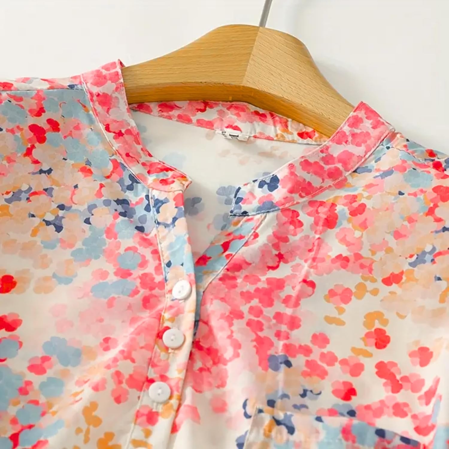 Close-up details of floral mandarin collar shirt with half placket and 3/4 sleeves