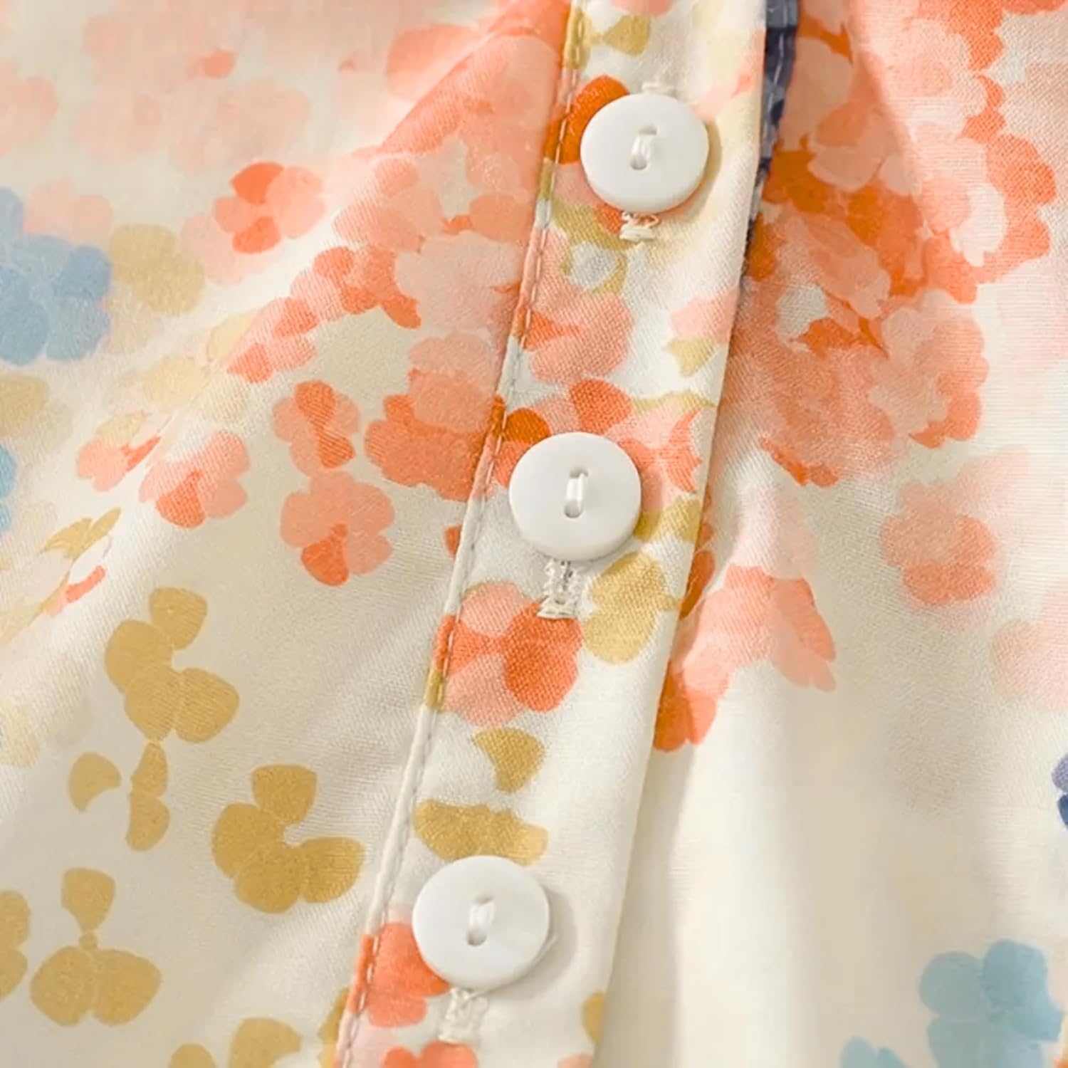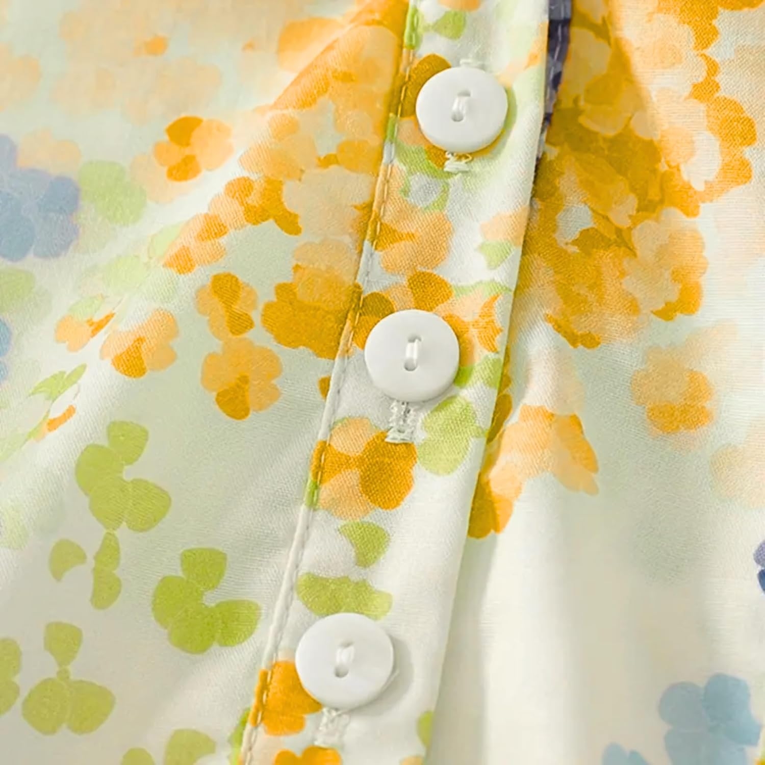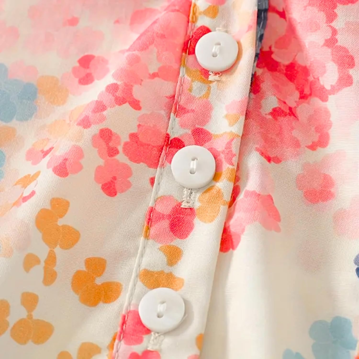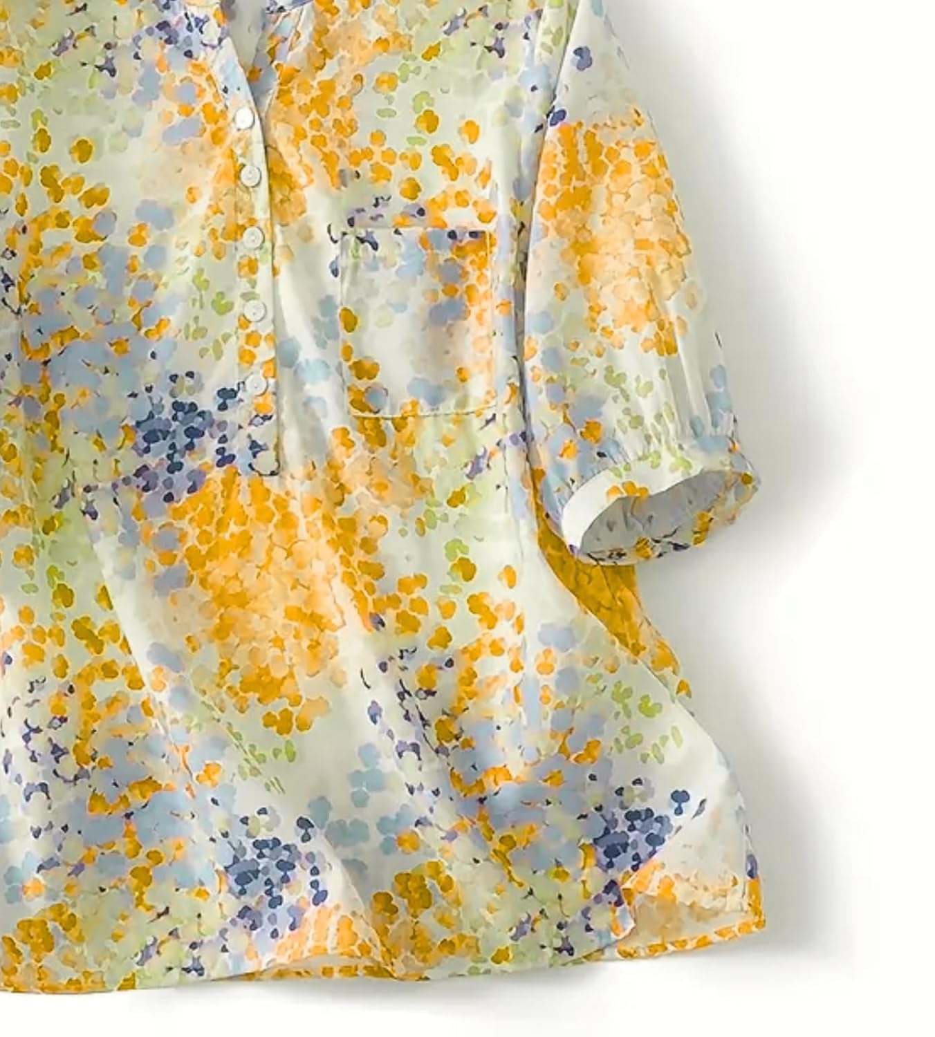 Close-up details of floral mandarin collar shirt with half placket and 3/4 sleeves