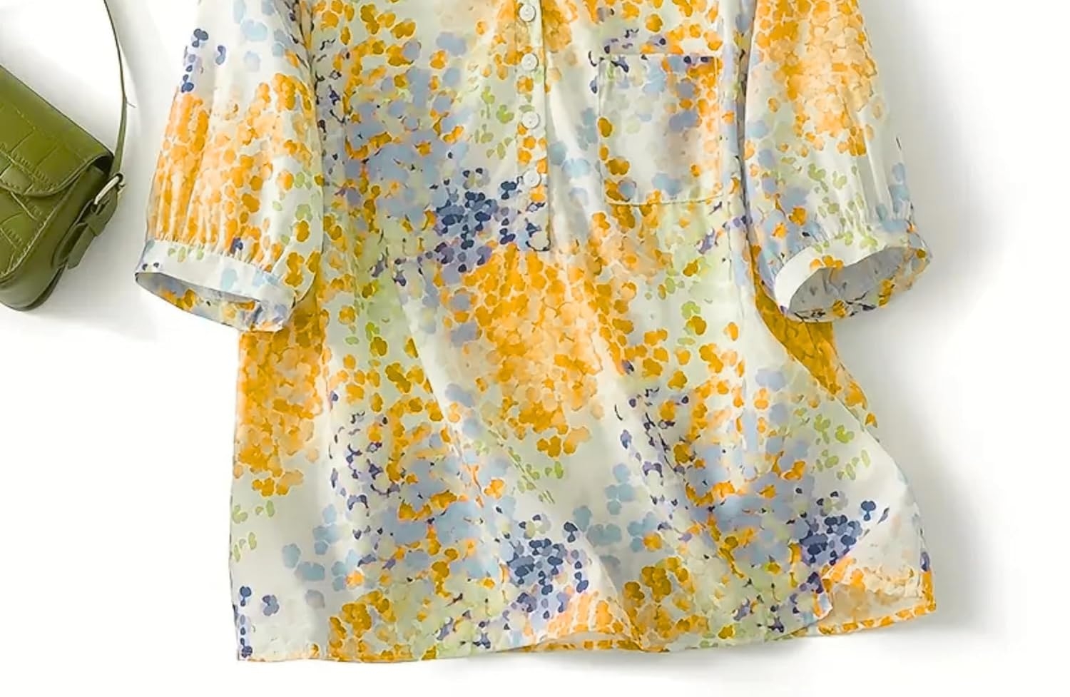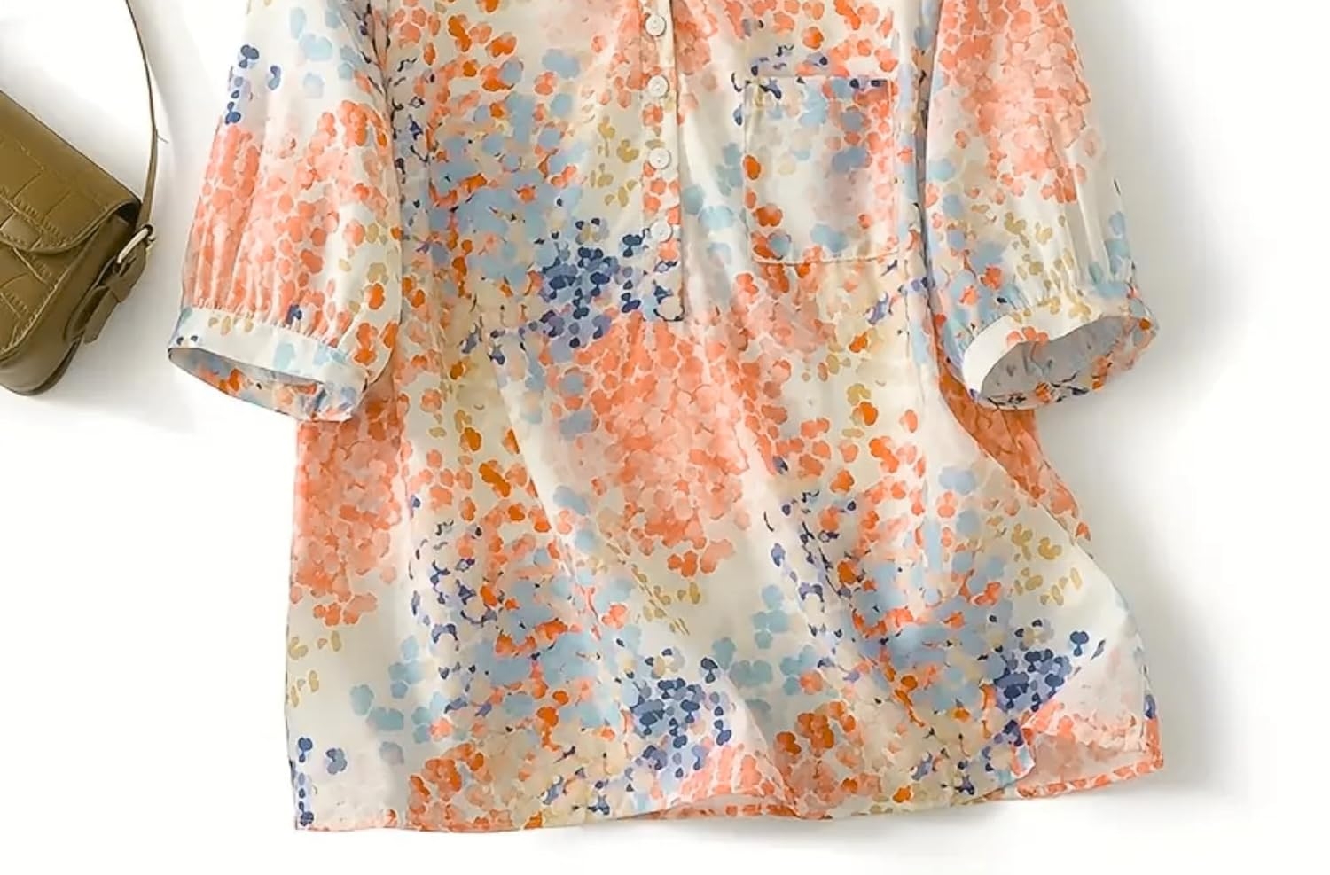 Annotated floral cotton shirt showing mandarin collar, breezy 3/4 sleeves