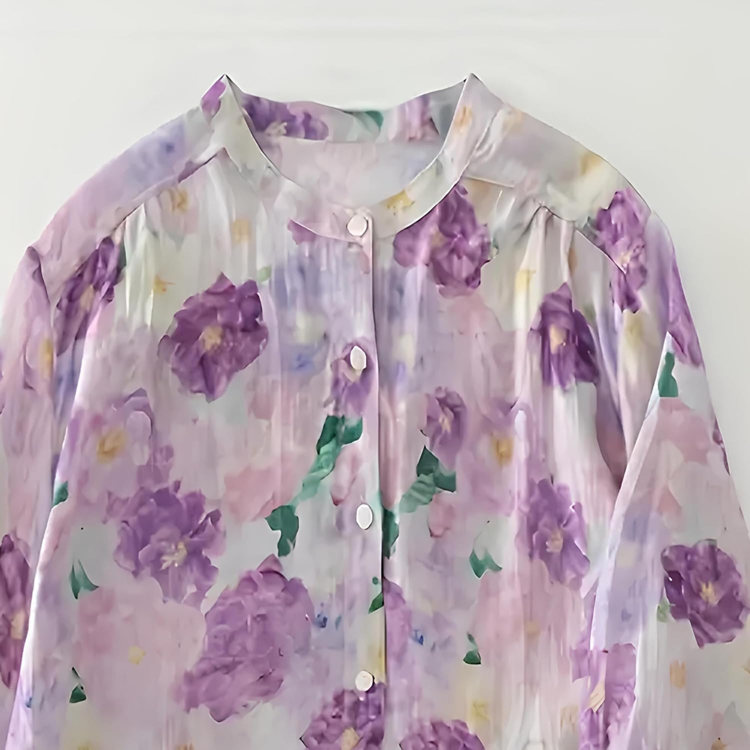 Lavender floral shirt close-up showing collared neck and puff sleeve detailing.