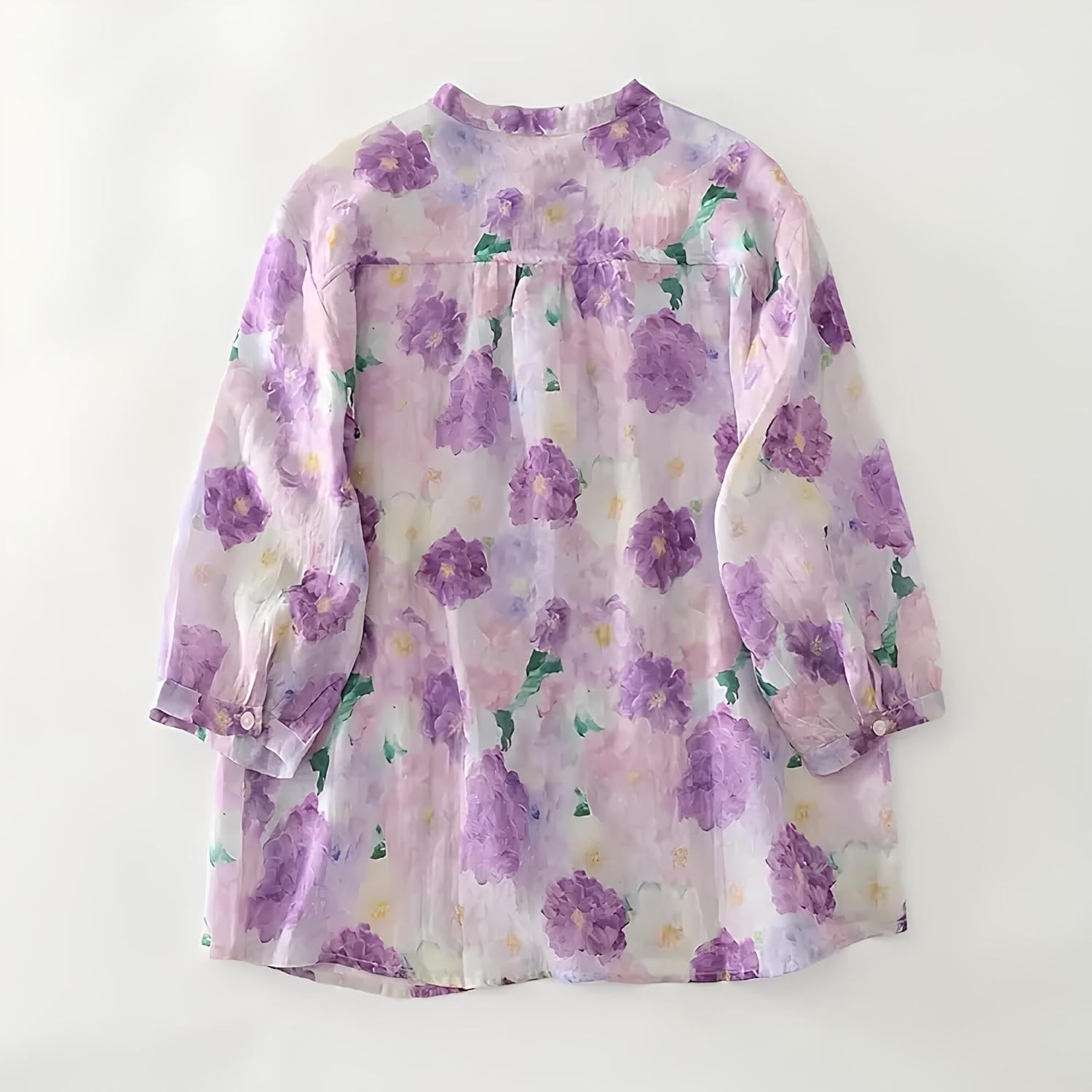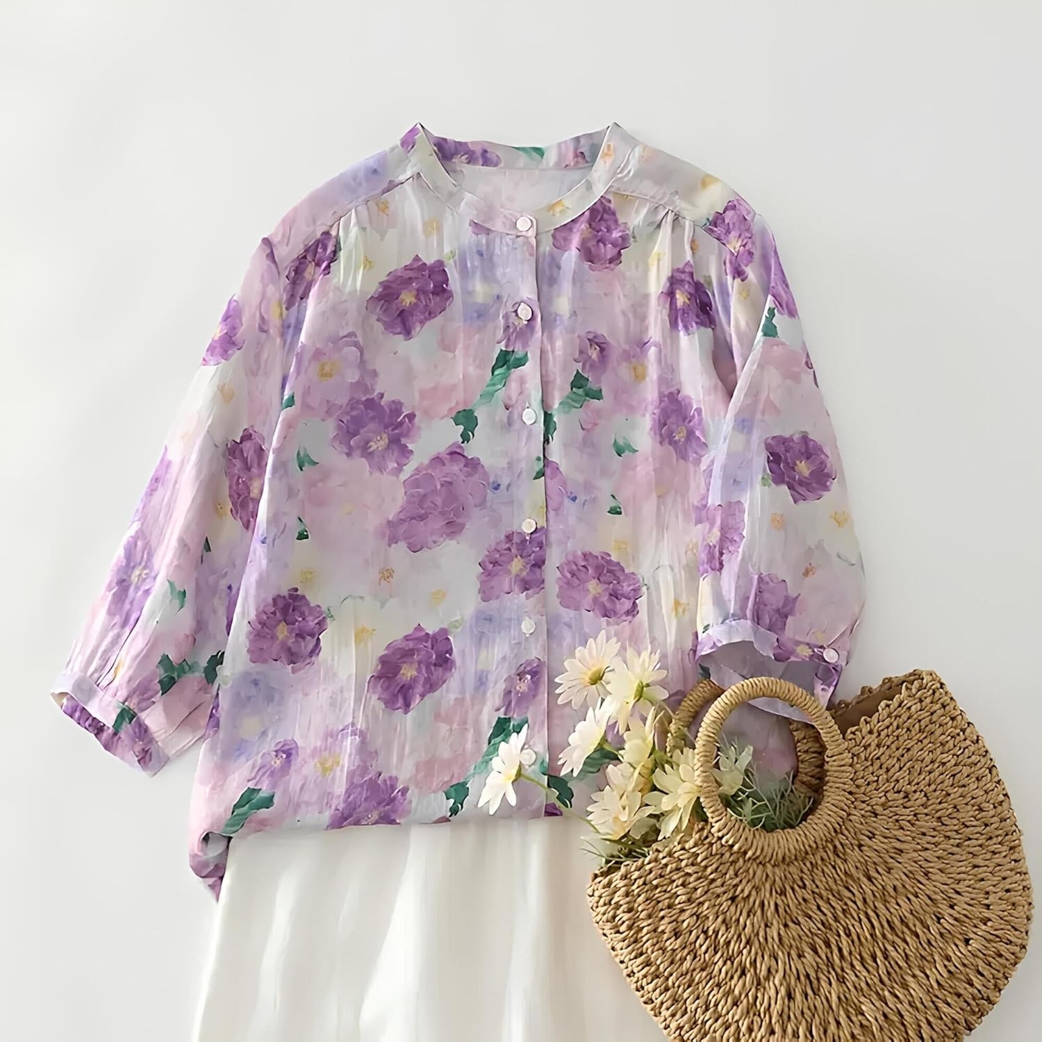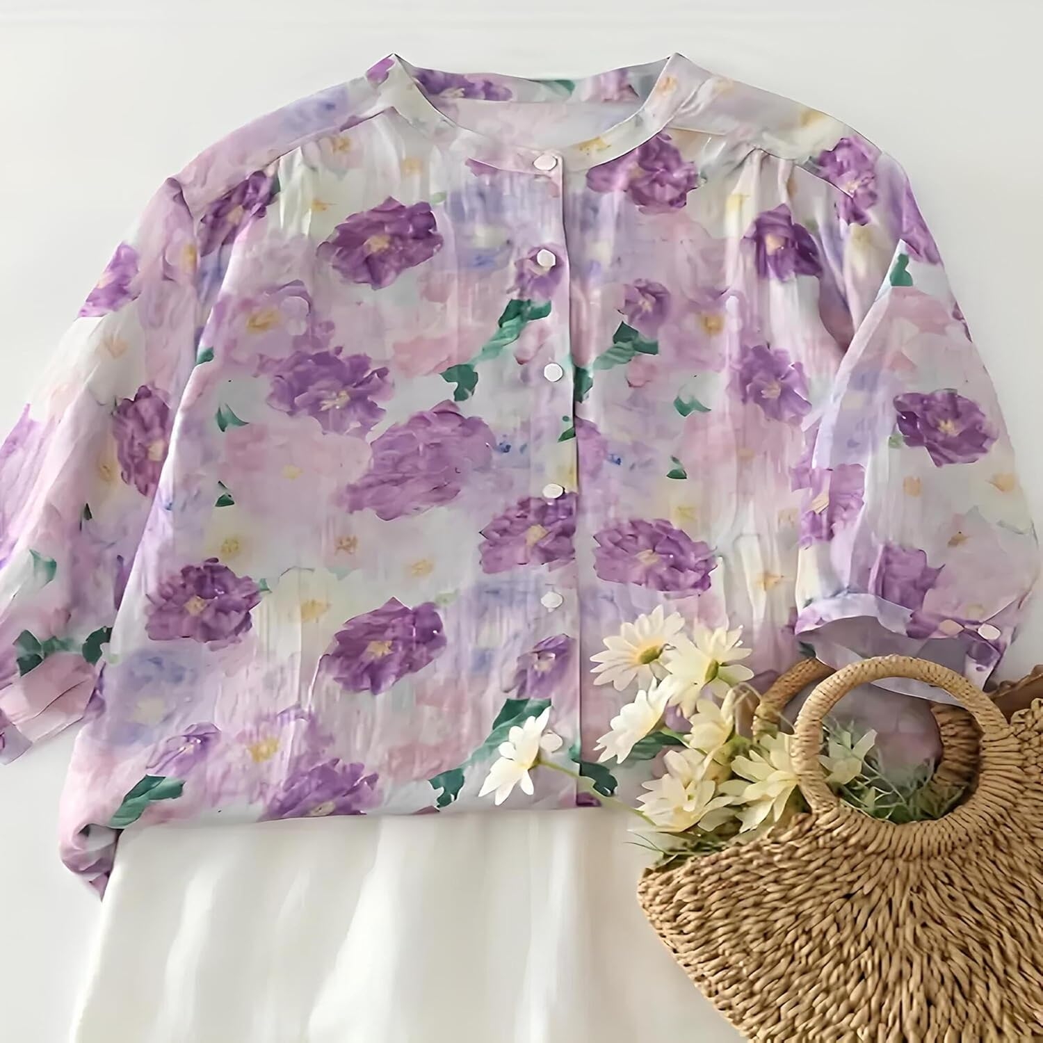 Lavender floral printed shirt with loose relaxed fit styled with casual accessories.