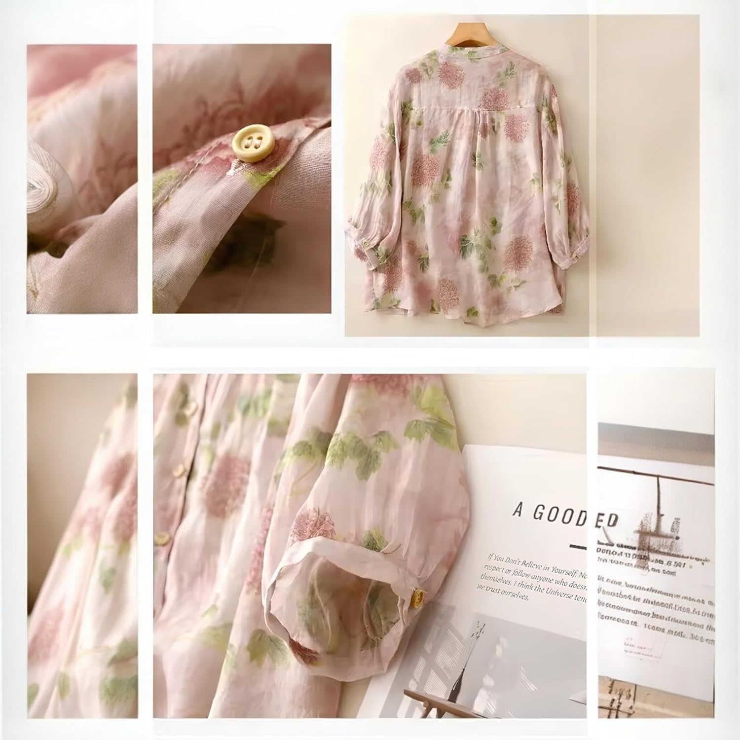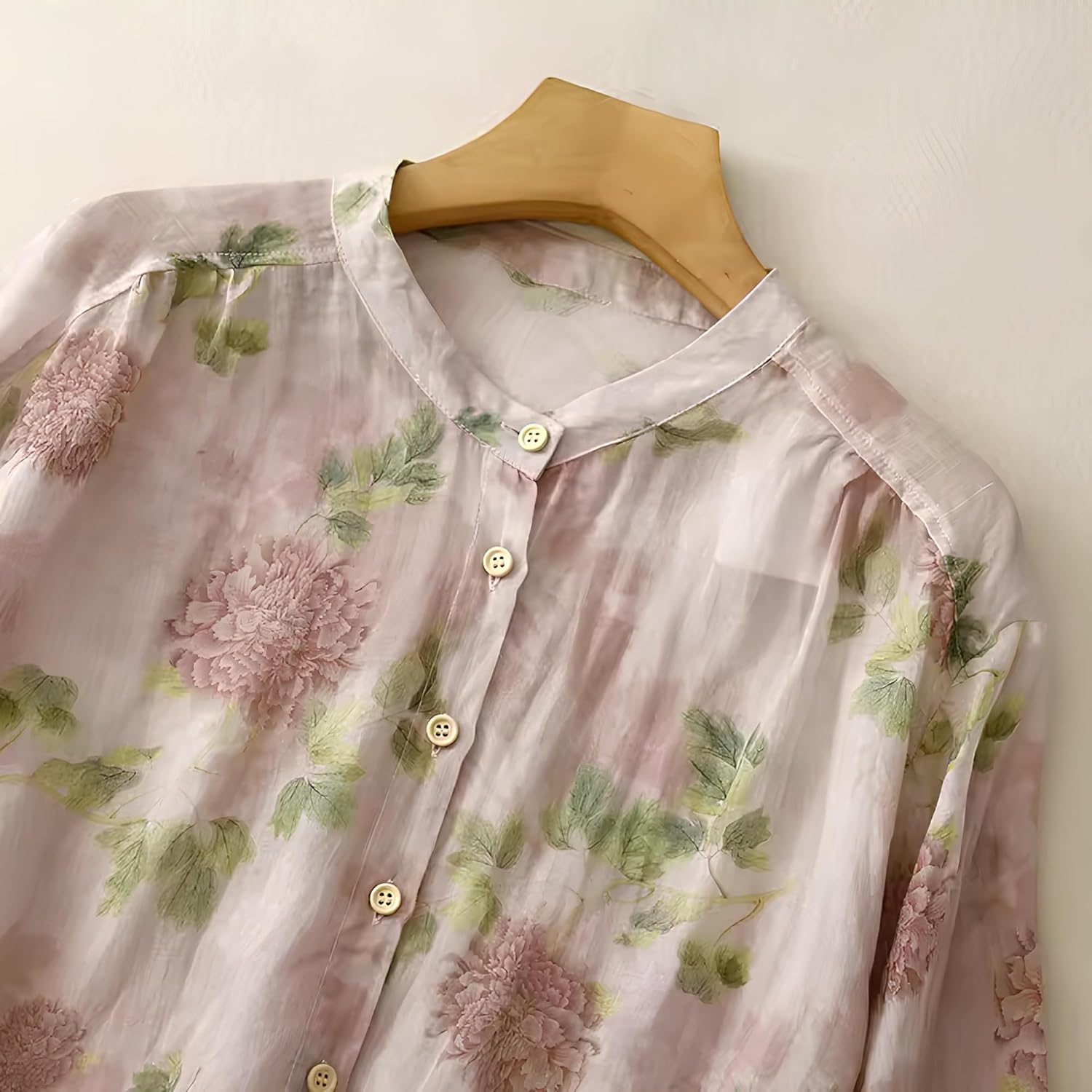 Gufrina Women’s Light Rose Floral Printed Button Down Shirt with Mandarin Collar and Relaxed Fit 3/4 Sleeves