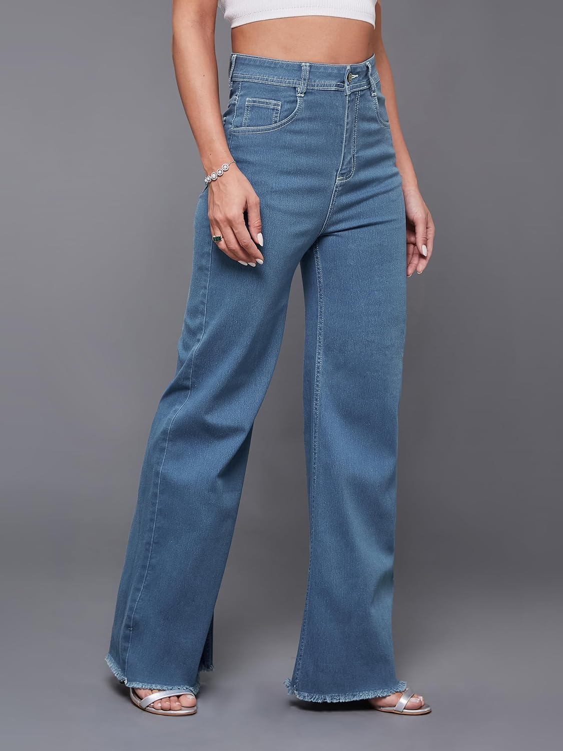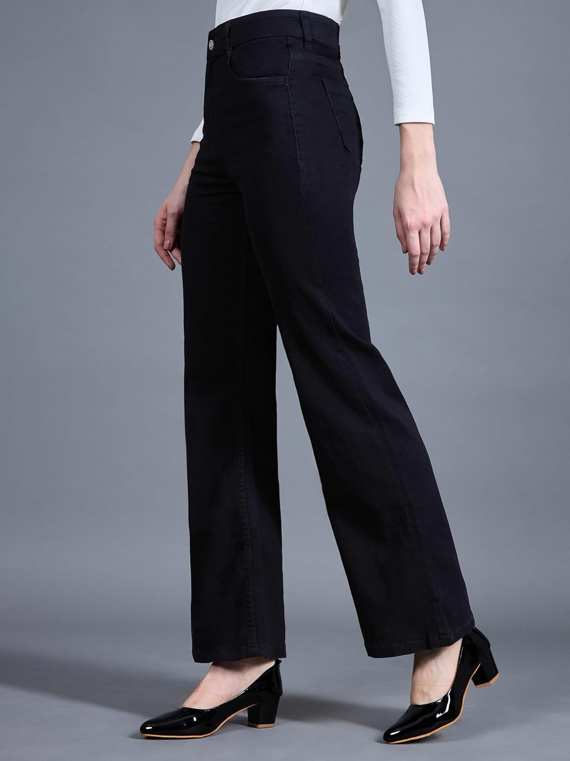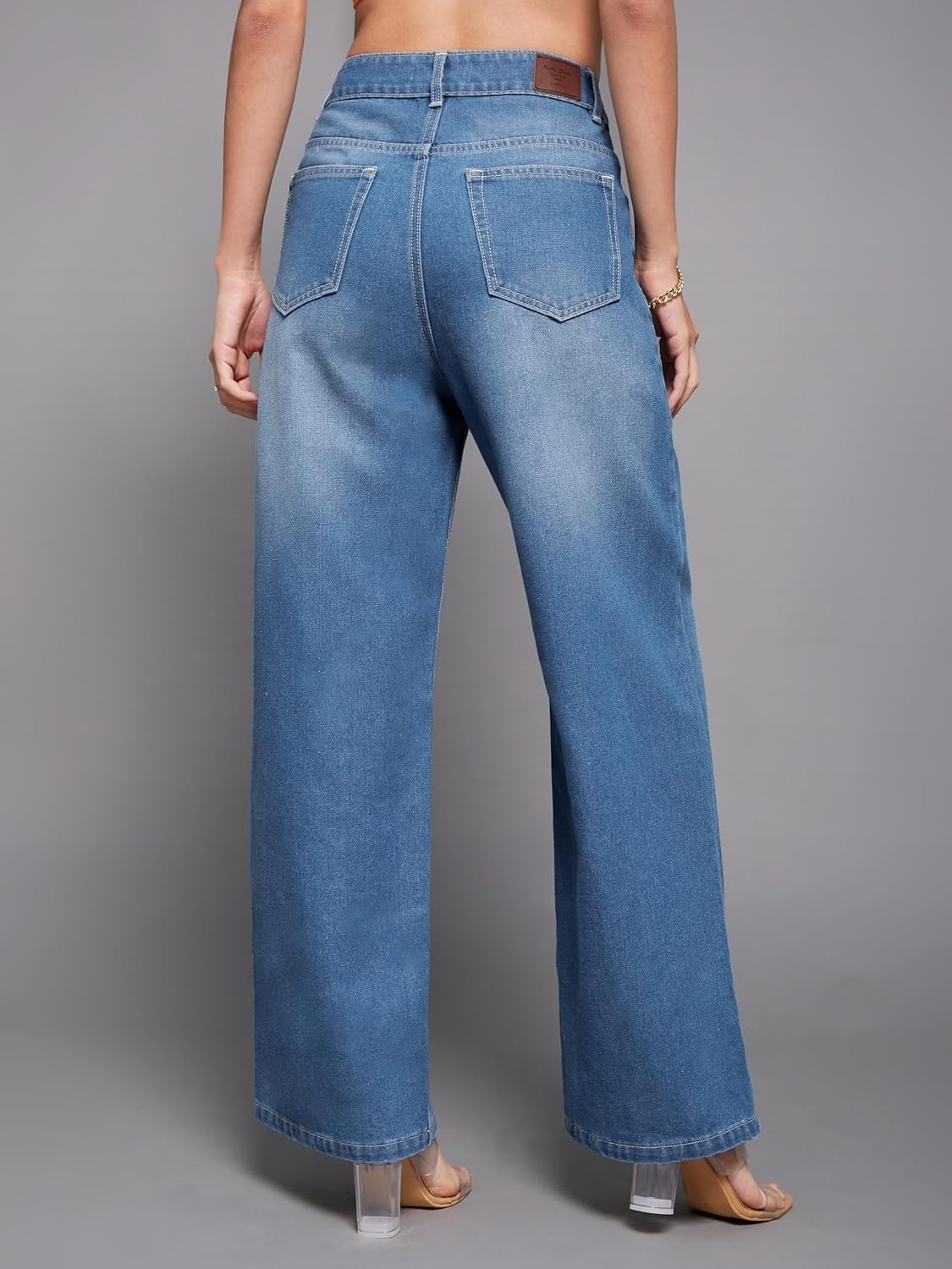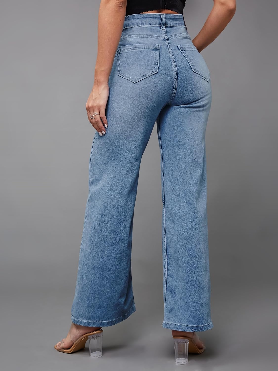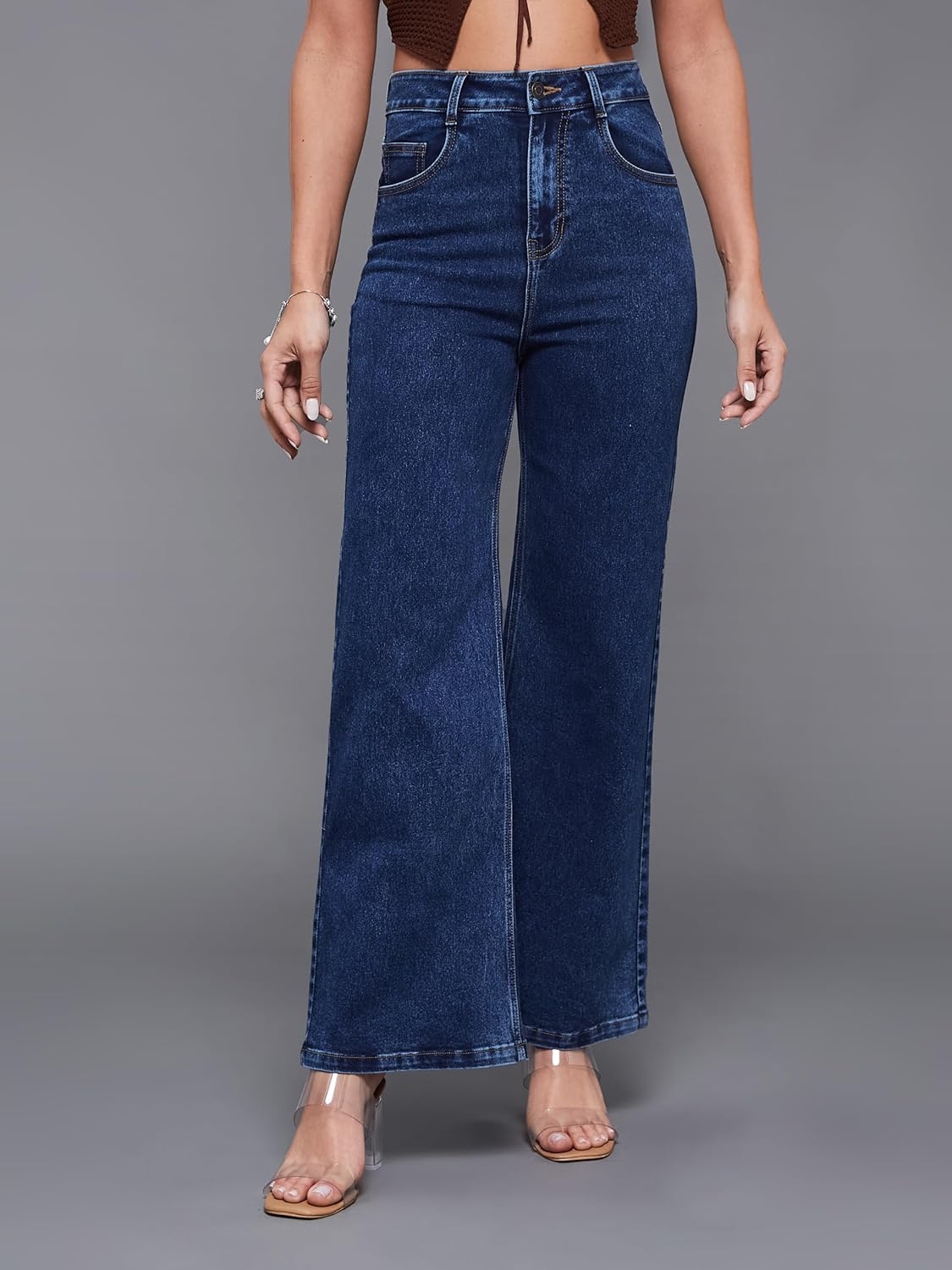• Style: Flared | Belt: NA | Closure: Button and Zip Fly | Length: Regular | Pockets: 1 Coin, 2 Patch & 2 Side Pocket | Fit: Wide leg | Stretch: No | Rise: High Rise