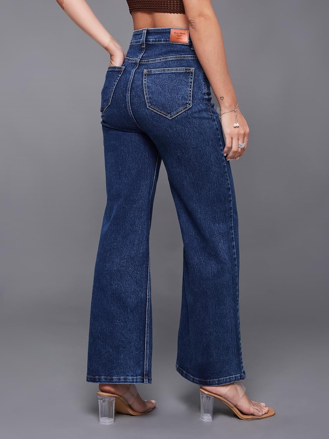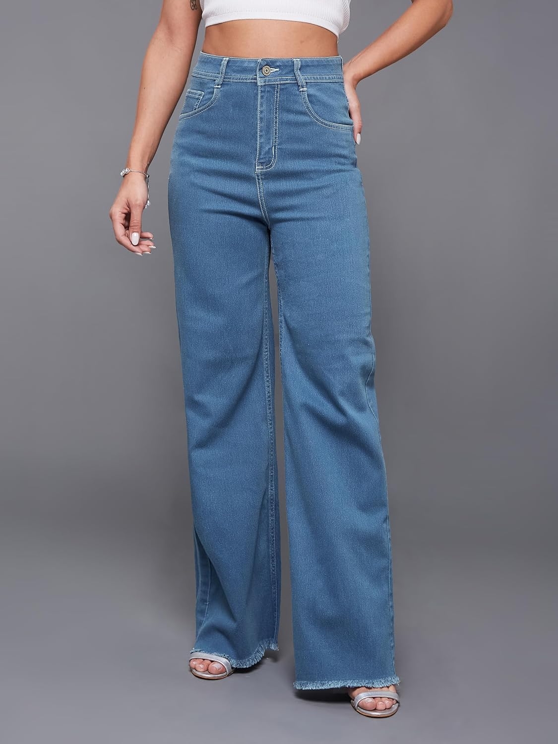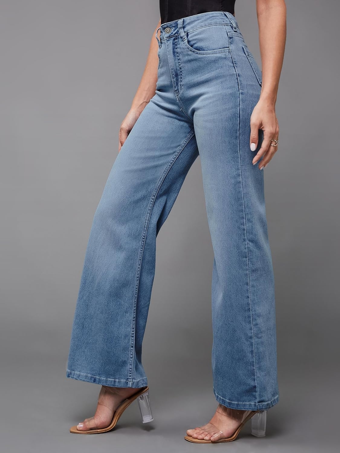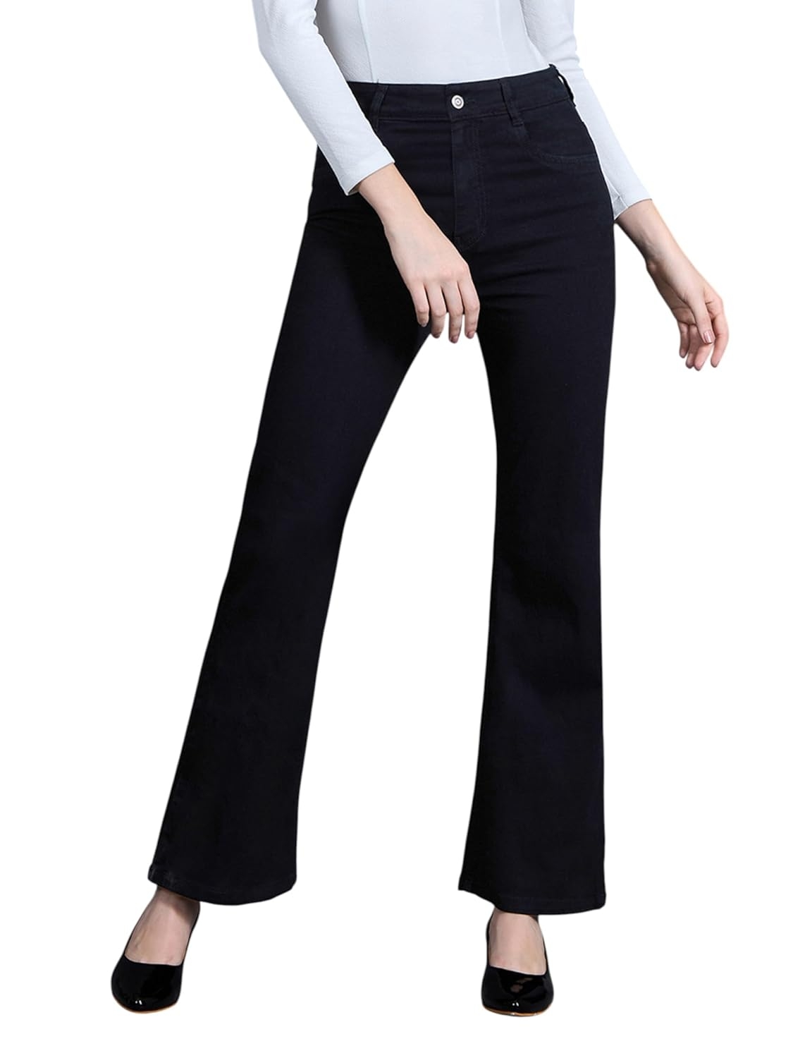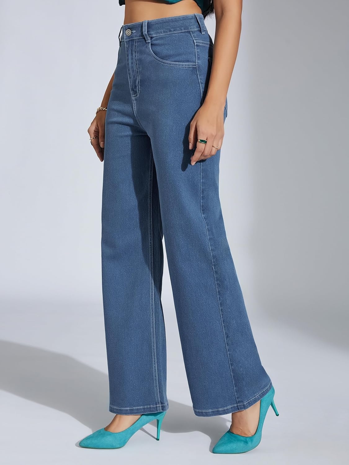 • Style: Flared | Belt: NA | Closure: Button and Zip Fly | Length: Regular | Pockets: 1 Coin, 2 Patch & 2 Side Pocket | Fit: Wide leg | Stretch: No | Rise: High Rise