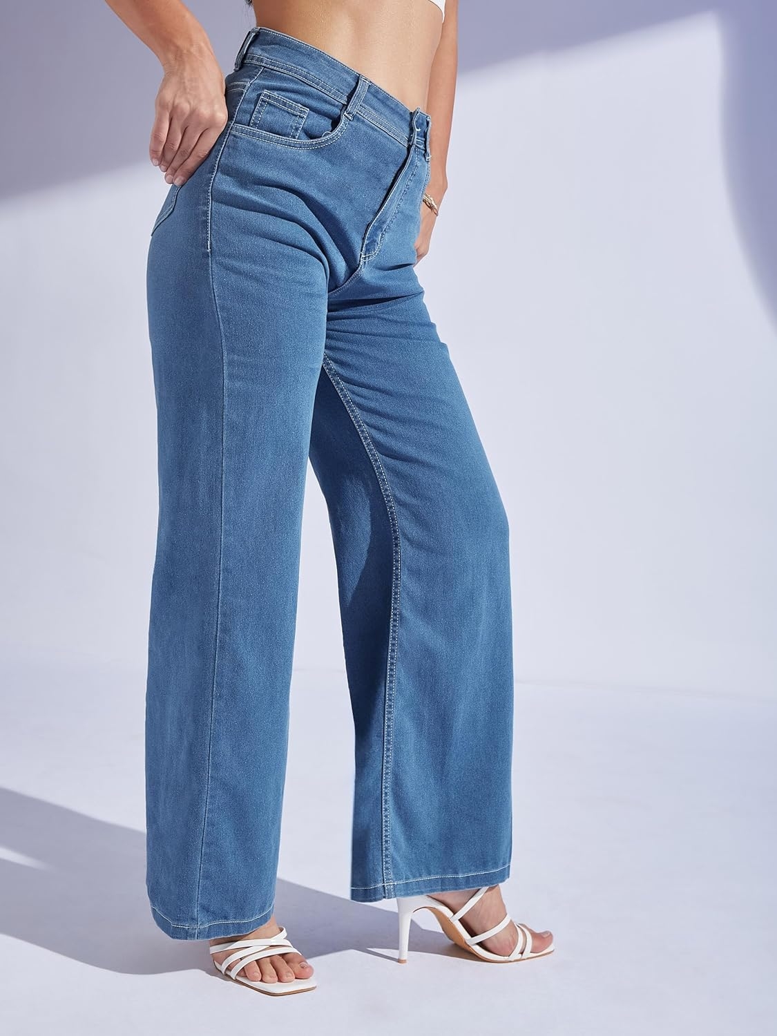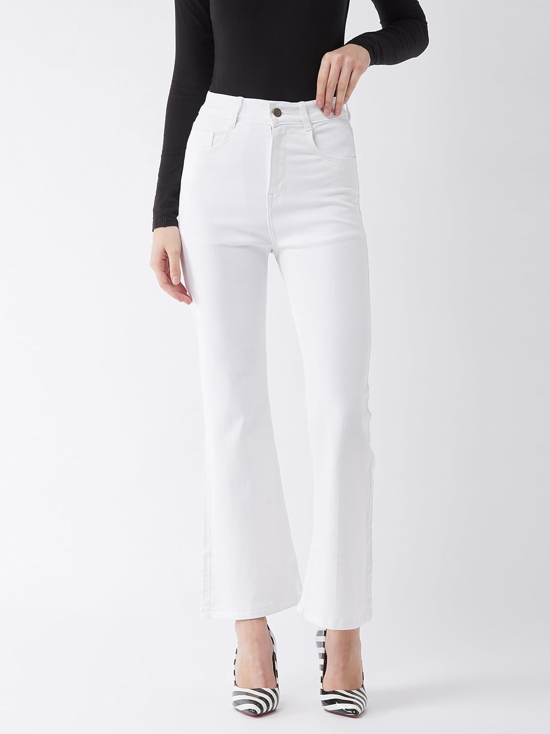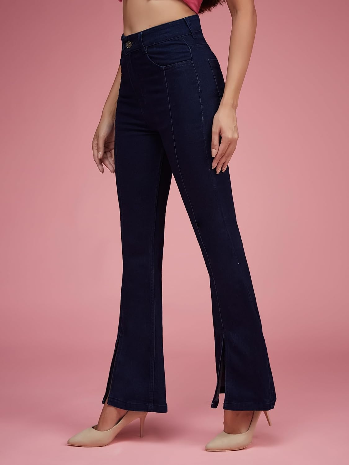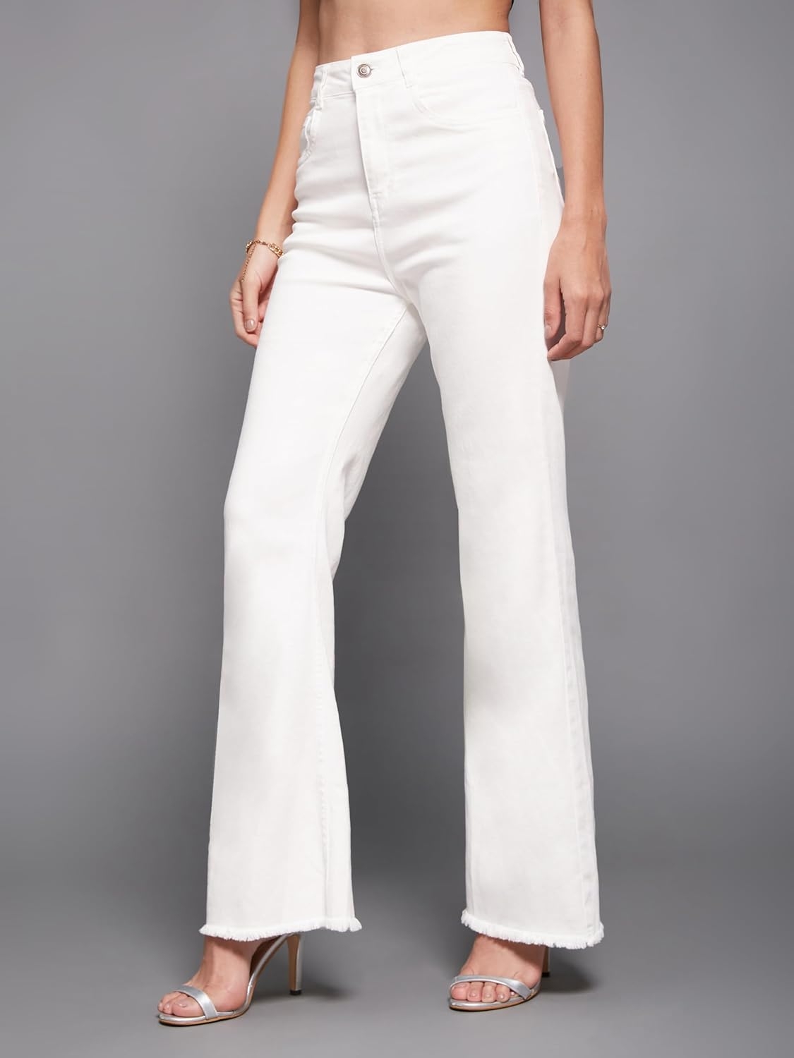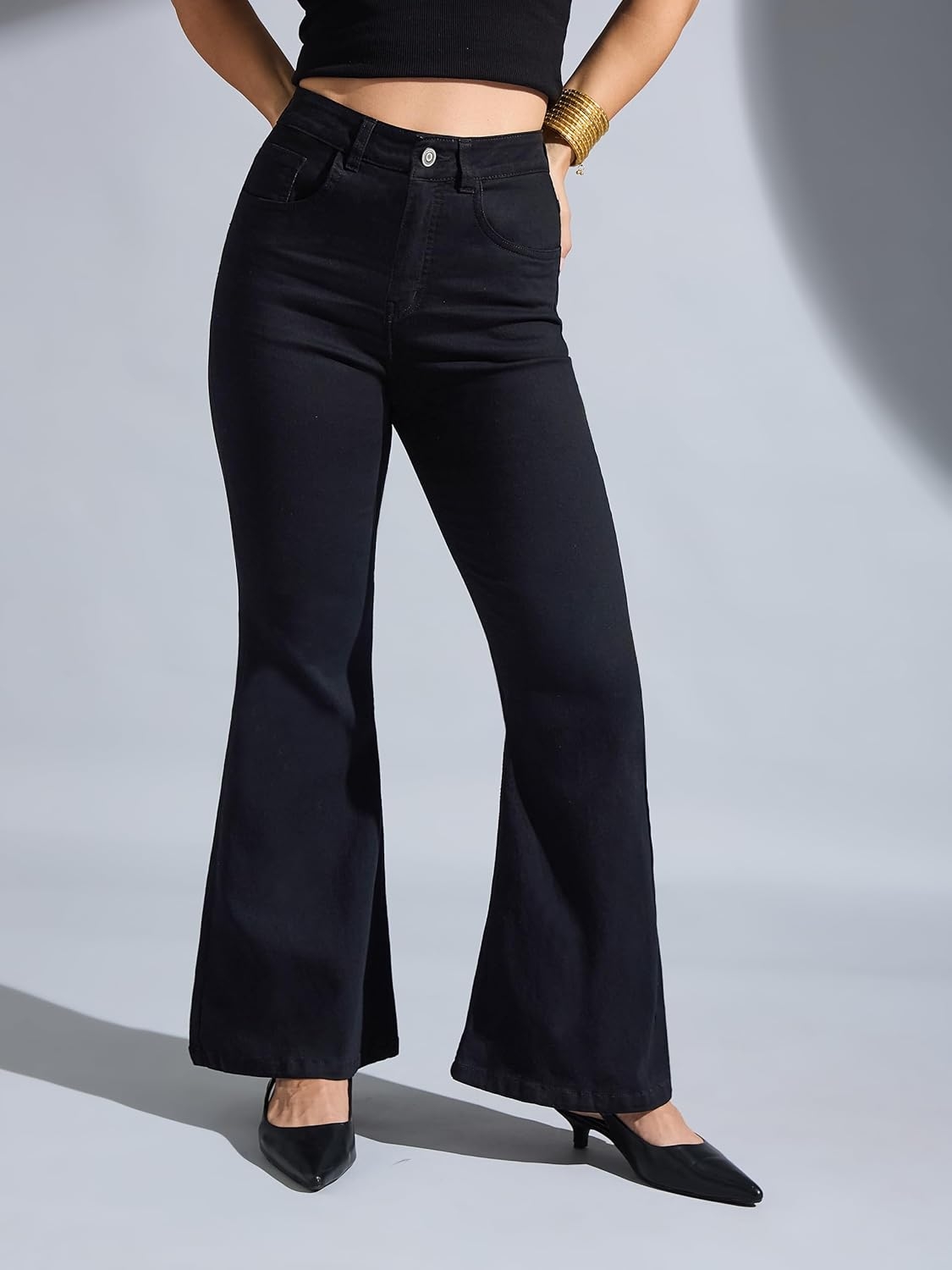 • Style: Flared | Belt: NA | Closure: Button and Zip Fly | Length: Regular | Pockets: 1 Coin, 2 Patch & 2 Side Pocket | Fit: Wide leg | Stretch: No | Rise: High Rise