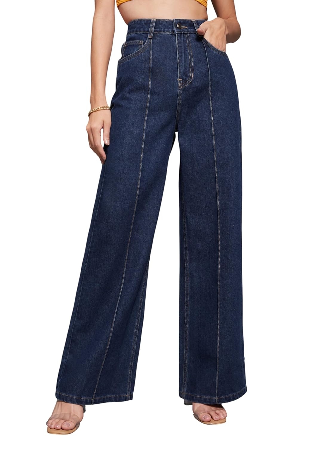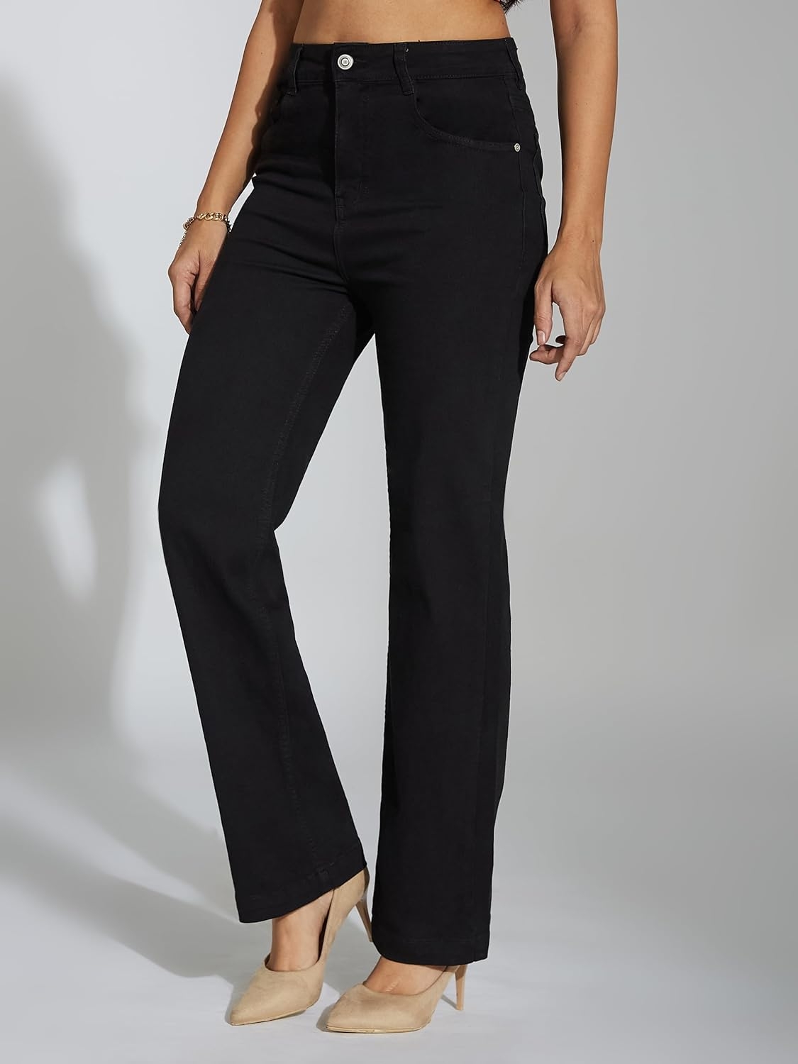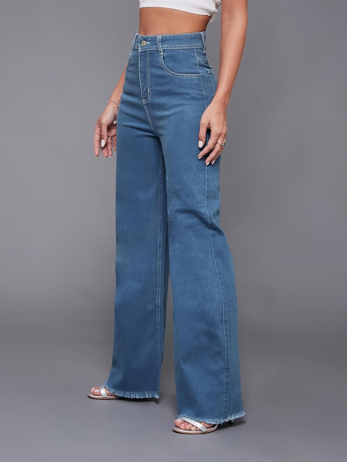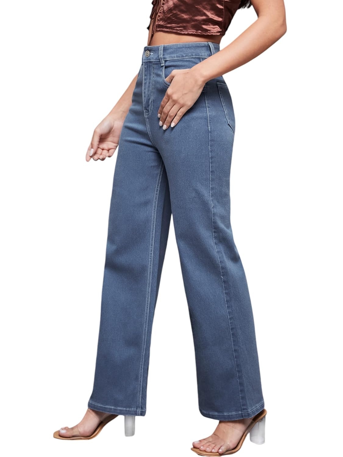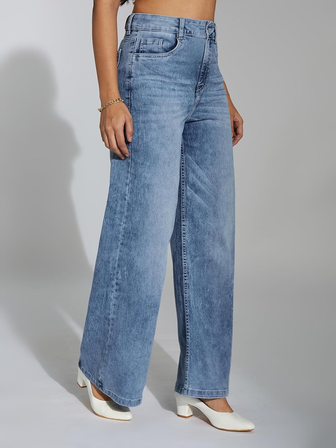 • Style: Flared | Belt: NA | Closure: Button and Zip Fly | Length: Regular | Pockets: 1 Coin, 2 Patch & 2 Side Pocket | Fit: Wide leg | Stretch: No | Rise: High Rise