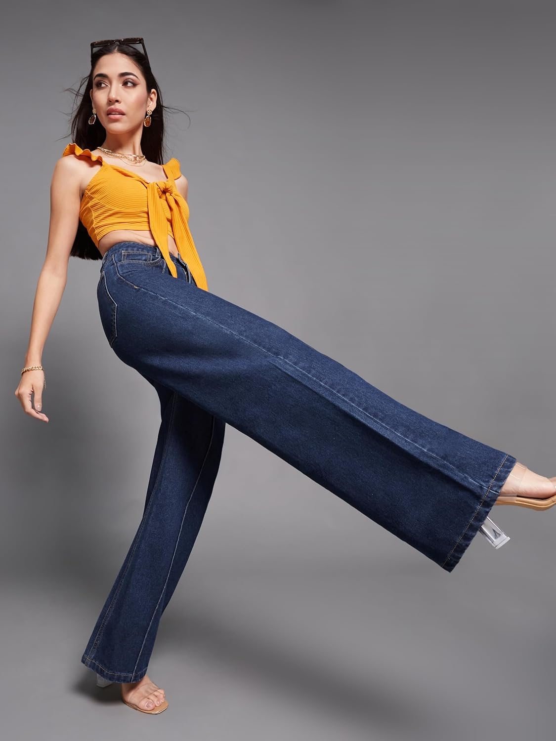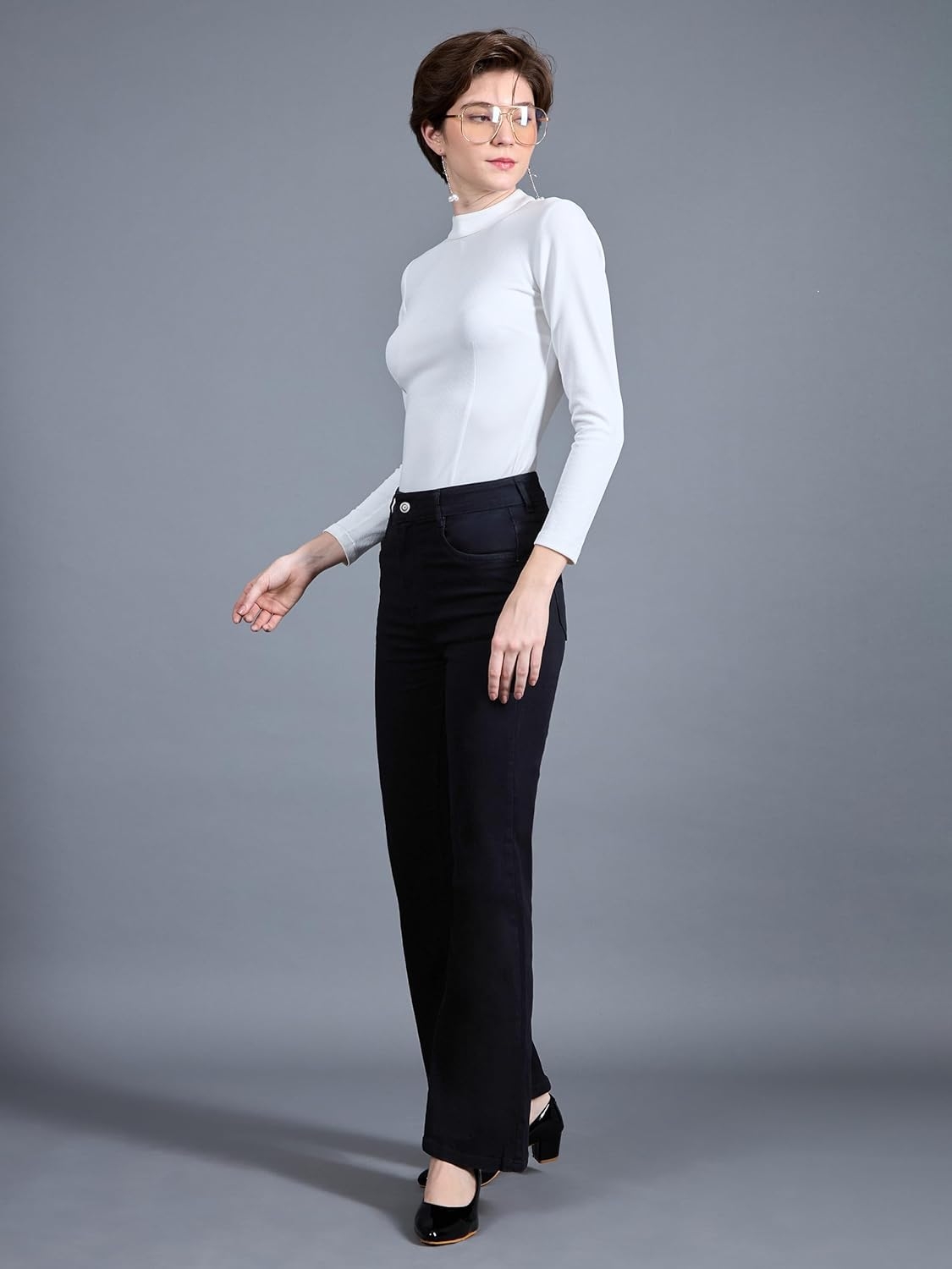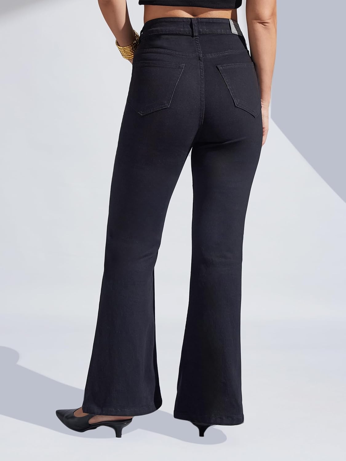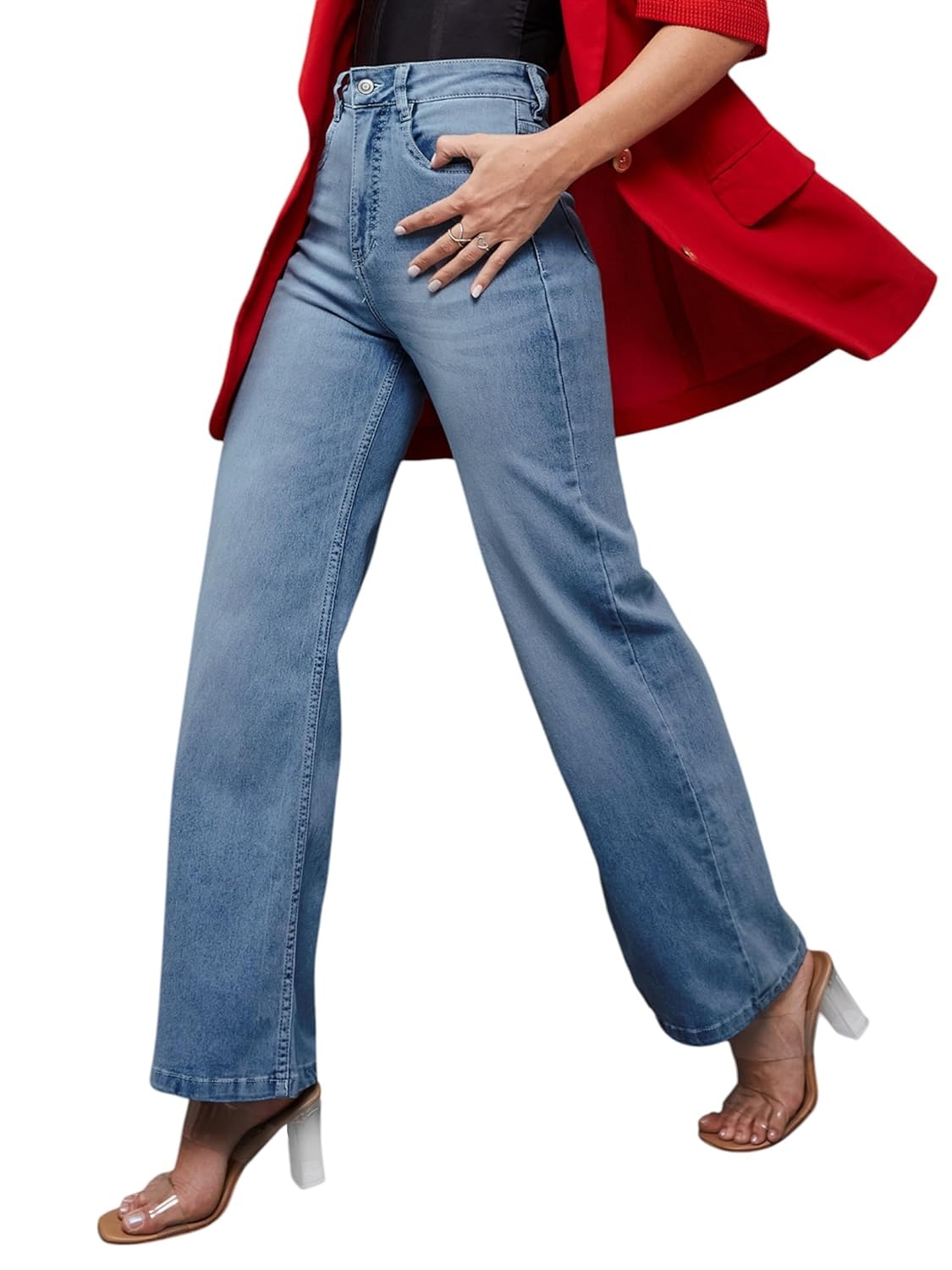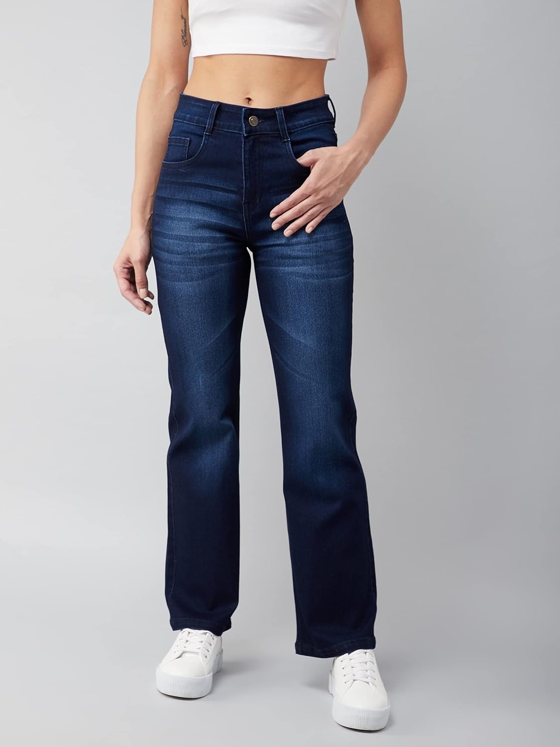 • Style: Flared | Belt: NA | Closure: Button and Zip Fly | Length: Regular | Pockets: 1 Coin, 2 Patch & 2 Side Pocket | Fit: Wide leg | Stretch: No | Rise: High Rise