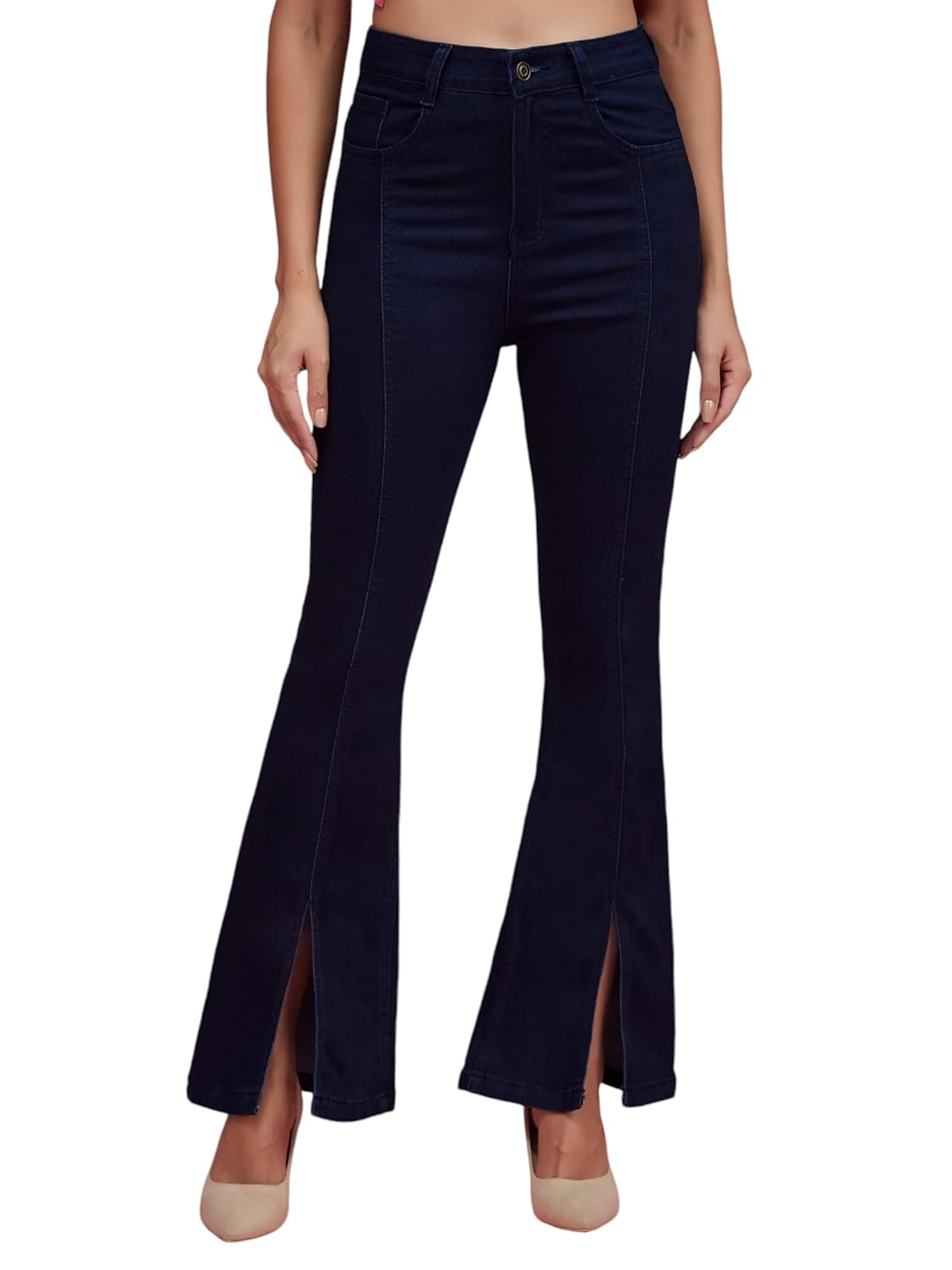 Blue flared mid rise regular length stretchable boot-cut denim jeans, Has five pockets, belt loops and a button zip closure, Has a clean look and slit detailing