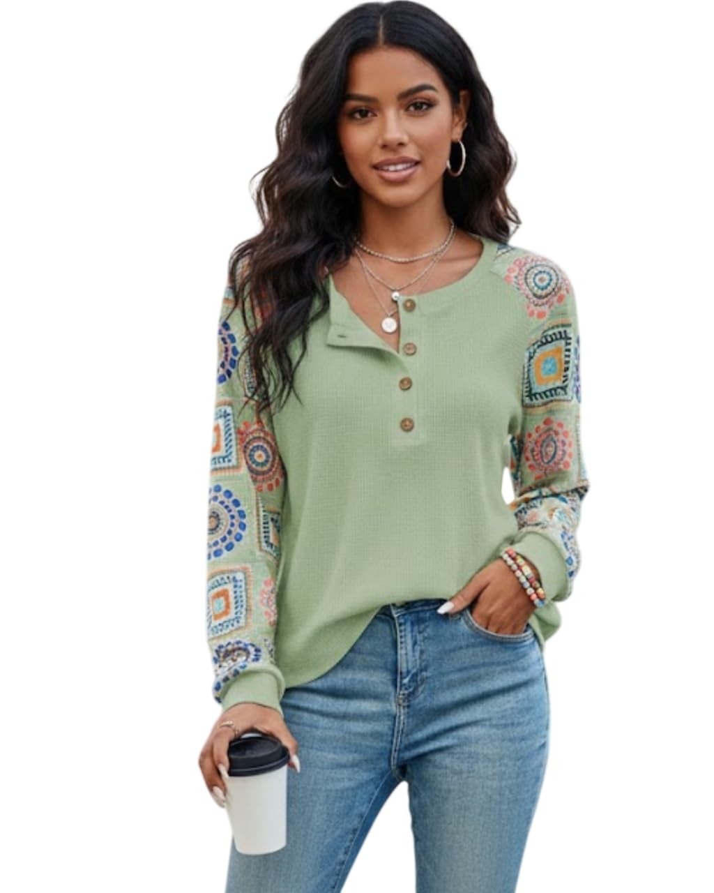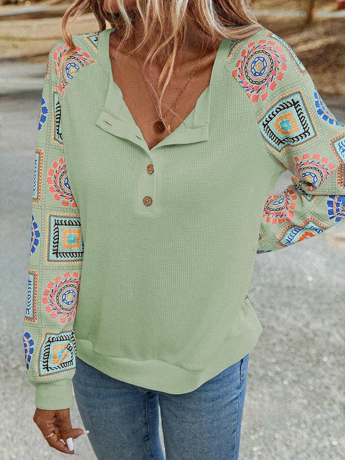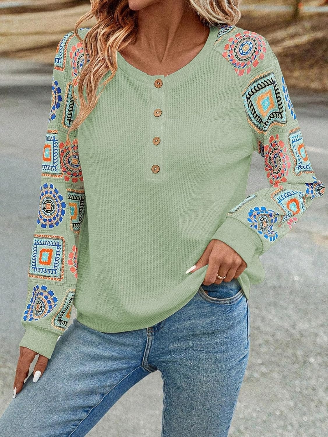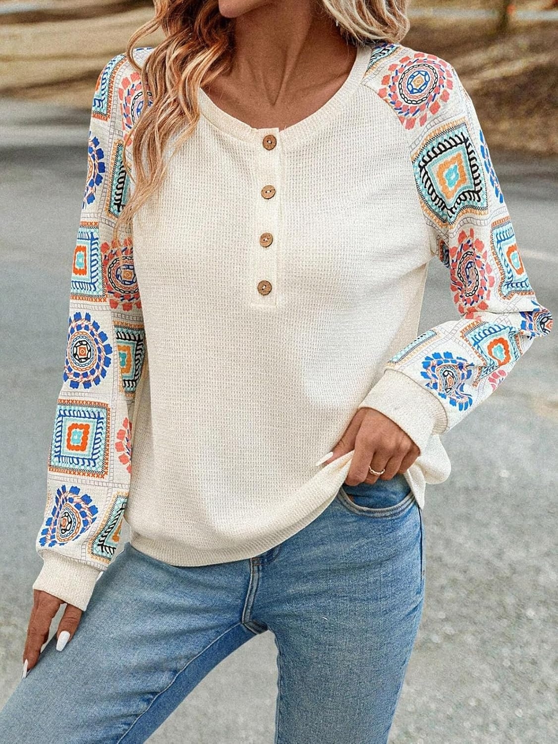 Geometric floral print top Regular fit top for women Round neck button top Trendy top for women