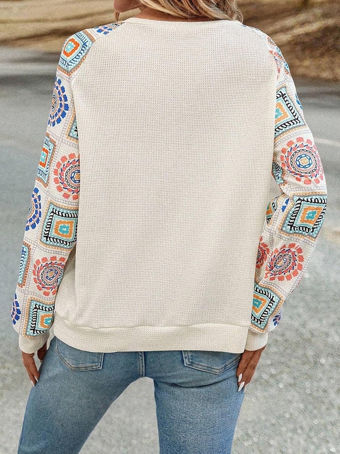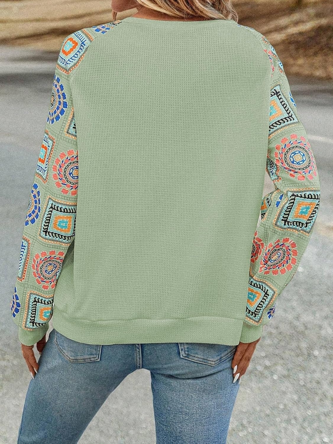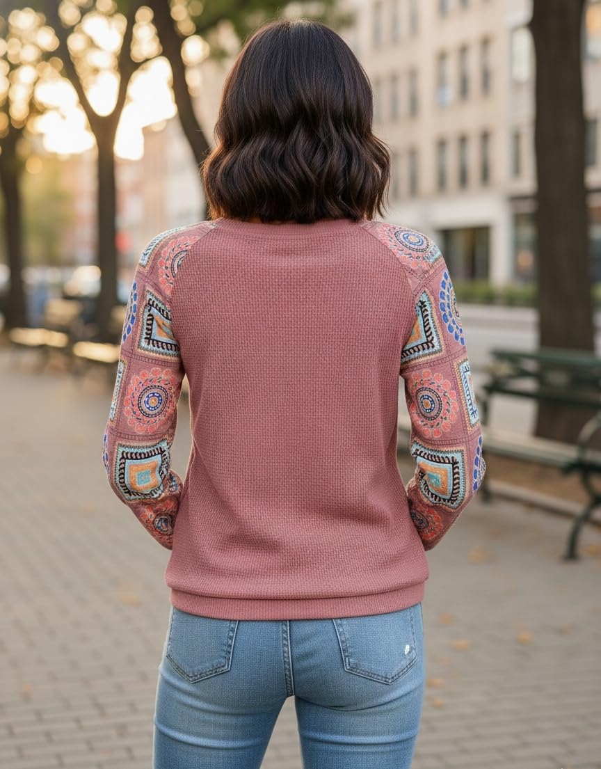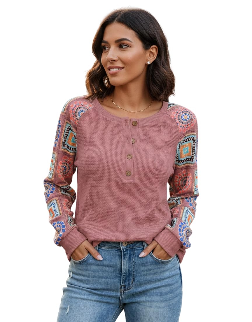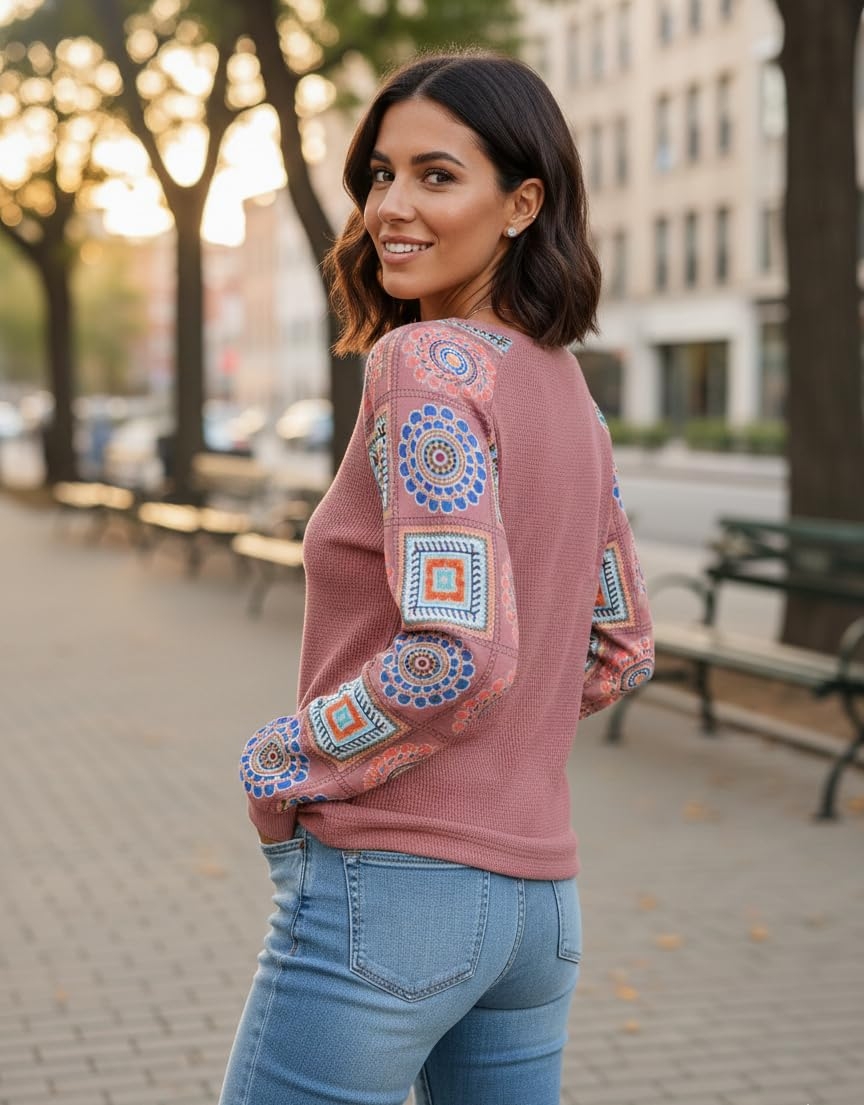 This geometric floral print round-neck top looks elegant and modern at the same time. The regular fit is very comfortable, and the full long sleeves add a classy touch. The fabric feels soft on the skin, the print is vibrant, and the overall quality is impressive. Perfect for casual outings or daily wear—highly recommended!