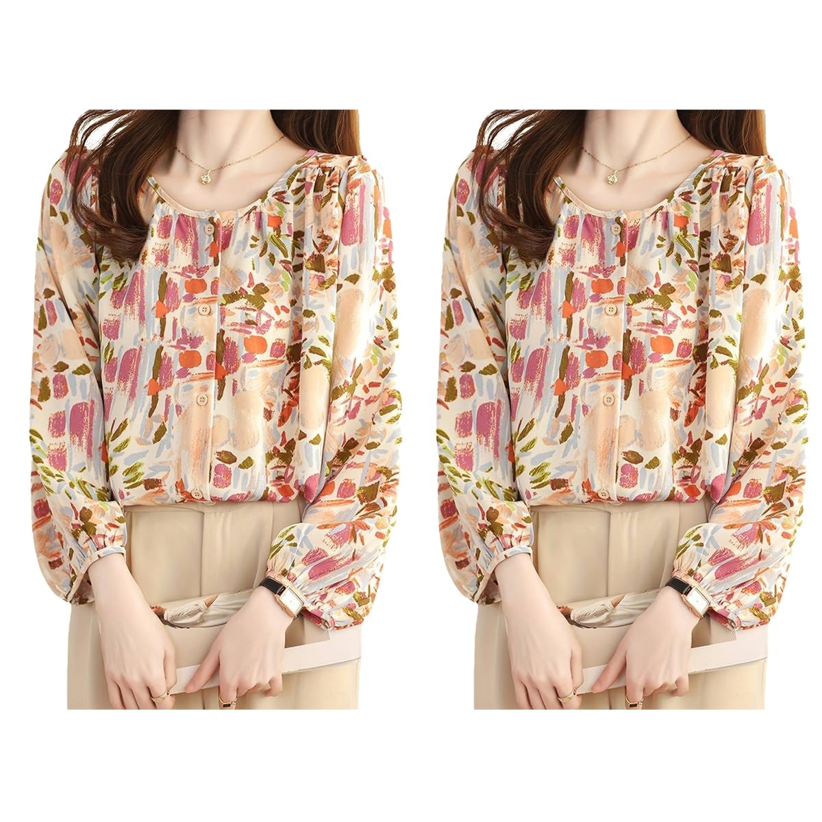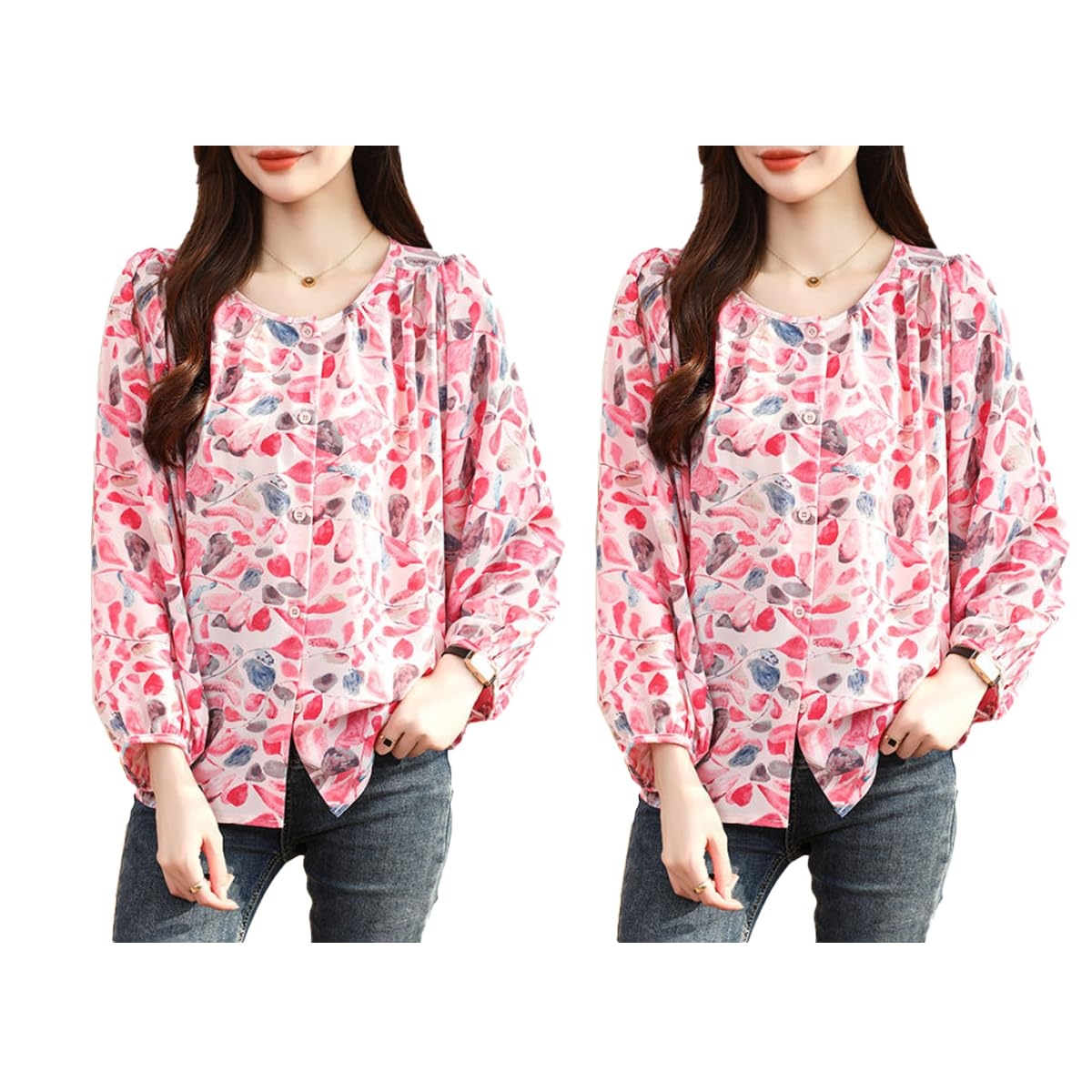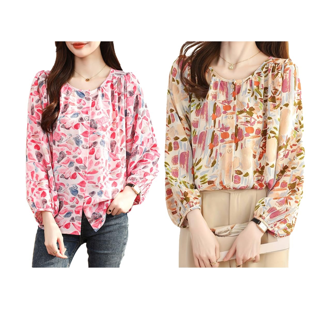 Upgrade your wardrobe with these stylish and elegant women’s tops, designed for a trendy yet sophisticated look. Featuring a regular fit and crafted from soft, breathable fabric, these tops ensure all-day comfort while keeping you effortlessly fashionable. The long puffed sleeves with elasticated cuffs add a modern touch, while the round neckline with button-down detailing enhances the overall charm.